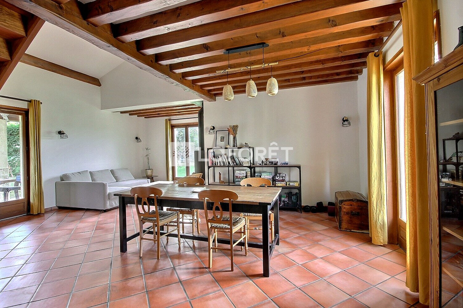 De bonne construction traditionnelle, vous découvrirez un vaste séjour lumineux, agrémenté par un poêle et enjolivé par un joli plafond à la Française. Sa cuisine se prolonge sur une terrasse à l'abri des regards.