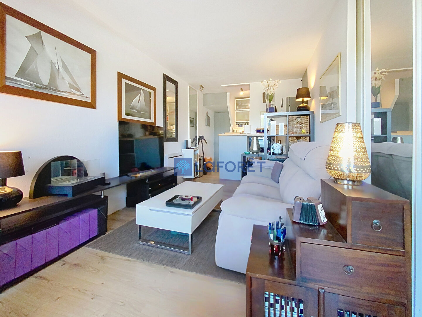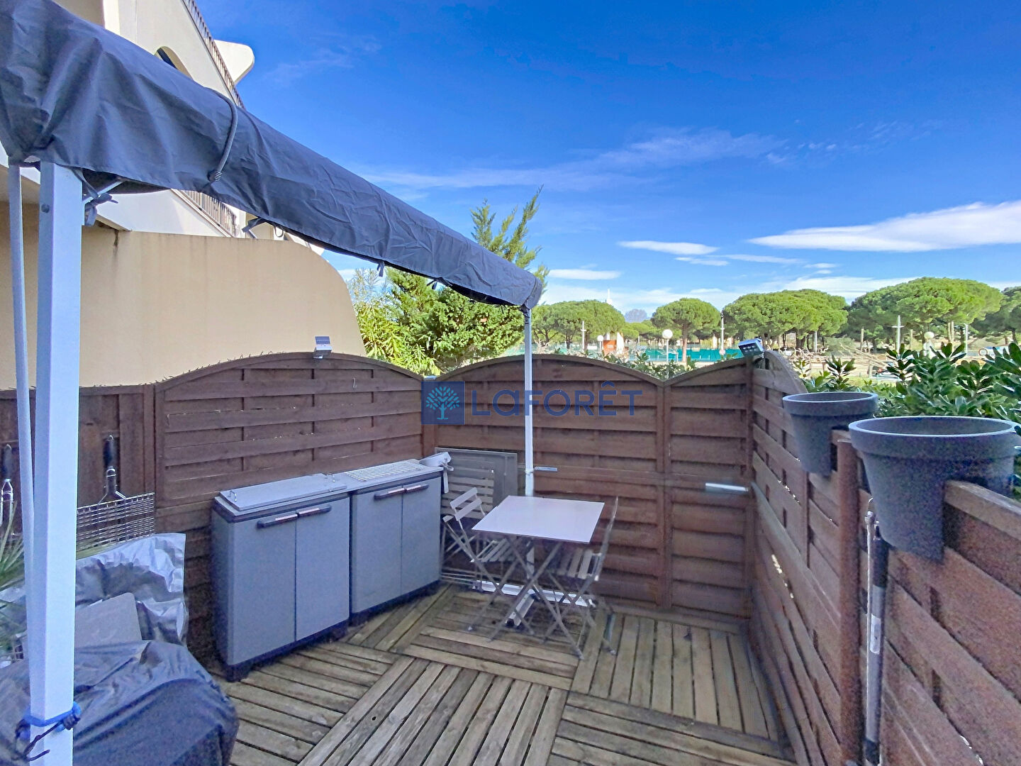 Dans une résidence avec piscine privative et parc arboré face au port de plaisance, appartement type T2 en rez-de-chaussée comprenant une entrée, une cuisine ouverte équipée, une pièce à vivre ouvrant sur une terrasse de 12m² clôturée, une chambre, un dressing,, une salle de bains et un WC séparé.