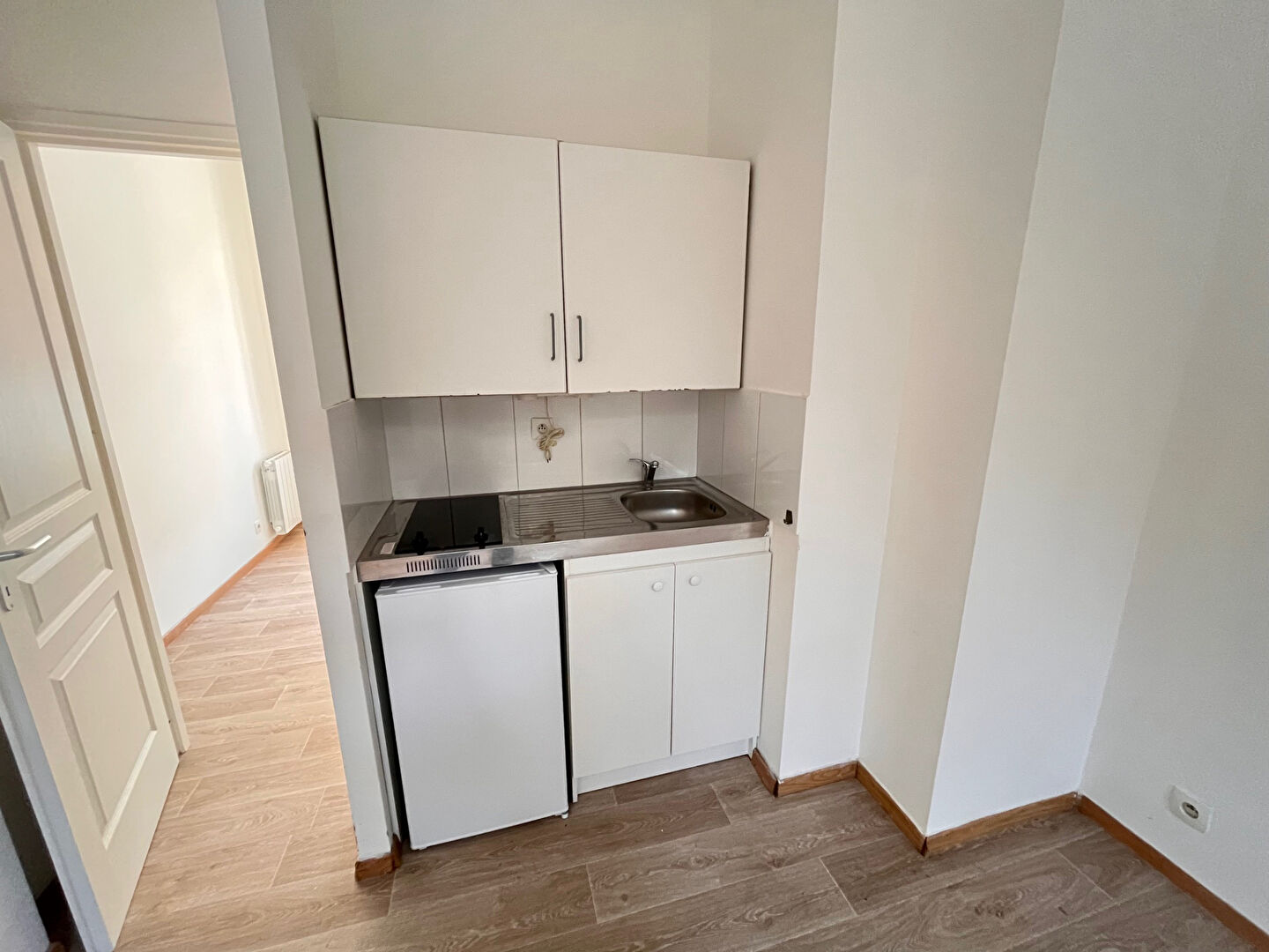 Pièce principale avec coin cuisine équipée, une chambre, salle de douches avec Wc.