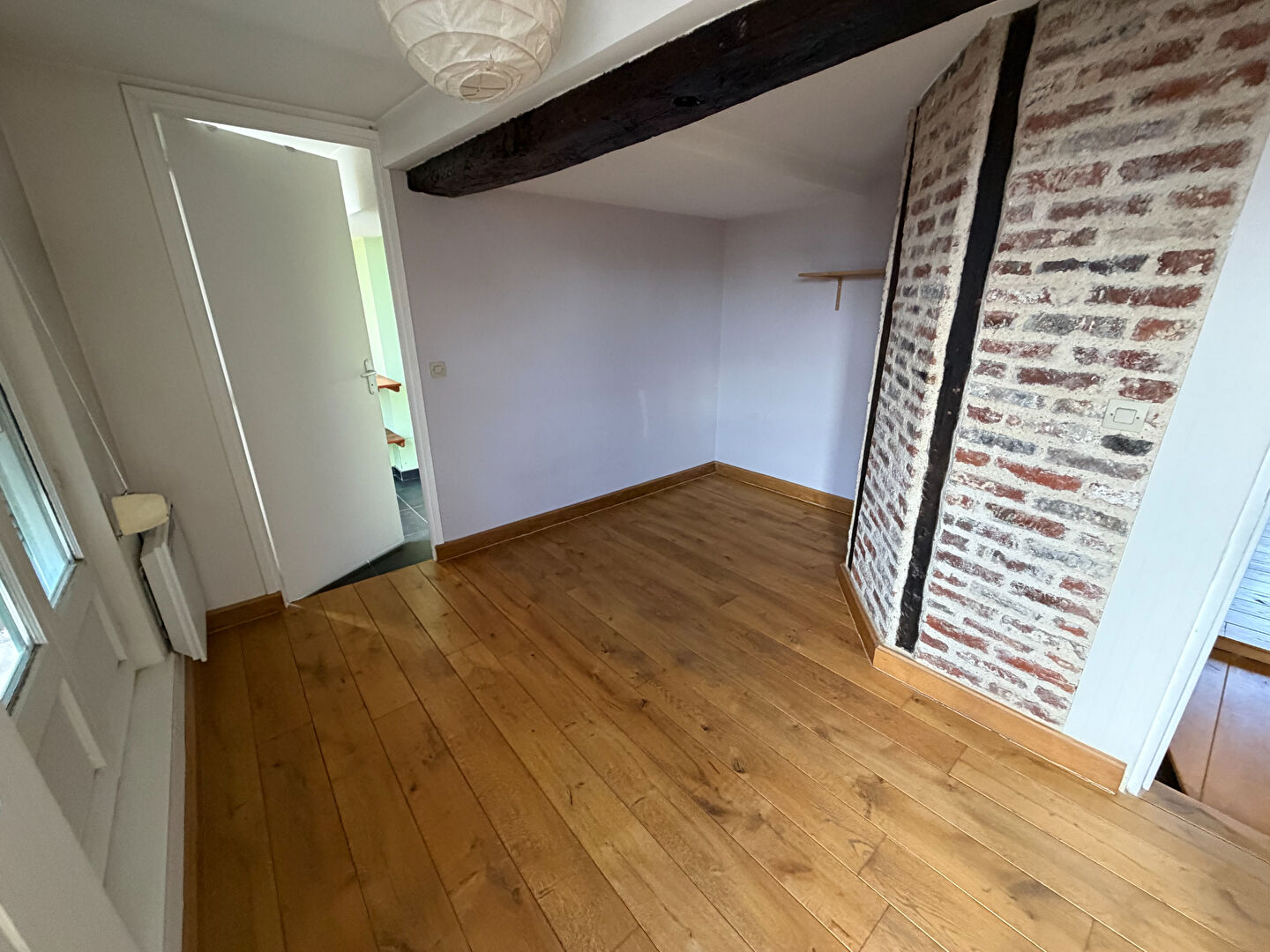 Grand séjour avec beaucoup de cachet, cuisine ouverte équipée, 2 chambres, salle de bains.