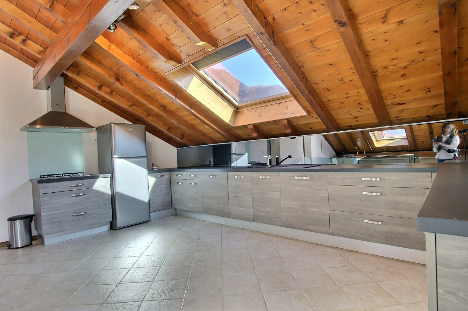 T3 : séjour mansardé XXL, cuisine moderne ouverte, 2 chambres avec rangements, salle d'eau contemporaine.