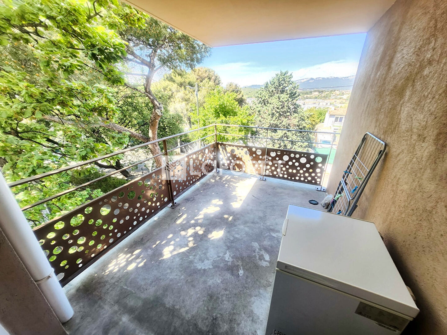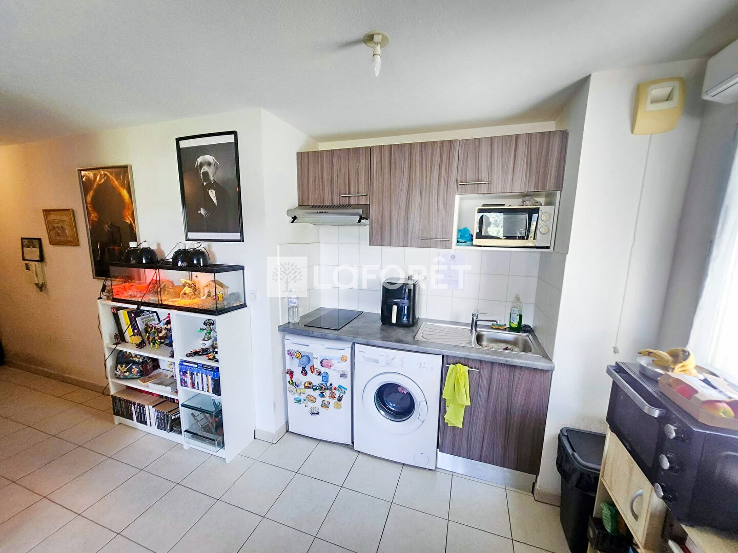 Le Bien se compose d'une Pièce de Vie lumineuse avec coin cuisine donnant sur une terrasse avec vue dégagée sur les Collines, 1 chambre avec placard intégré ainsi qu'une salle de bains avec WC.
