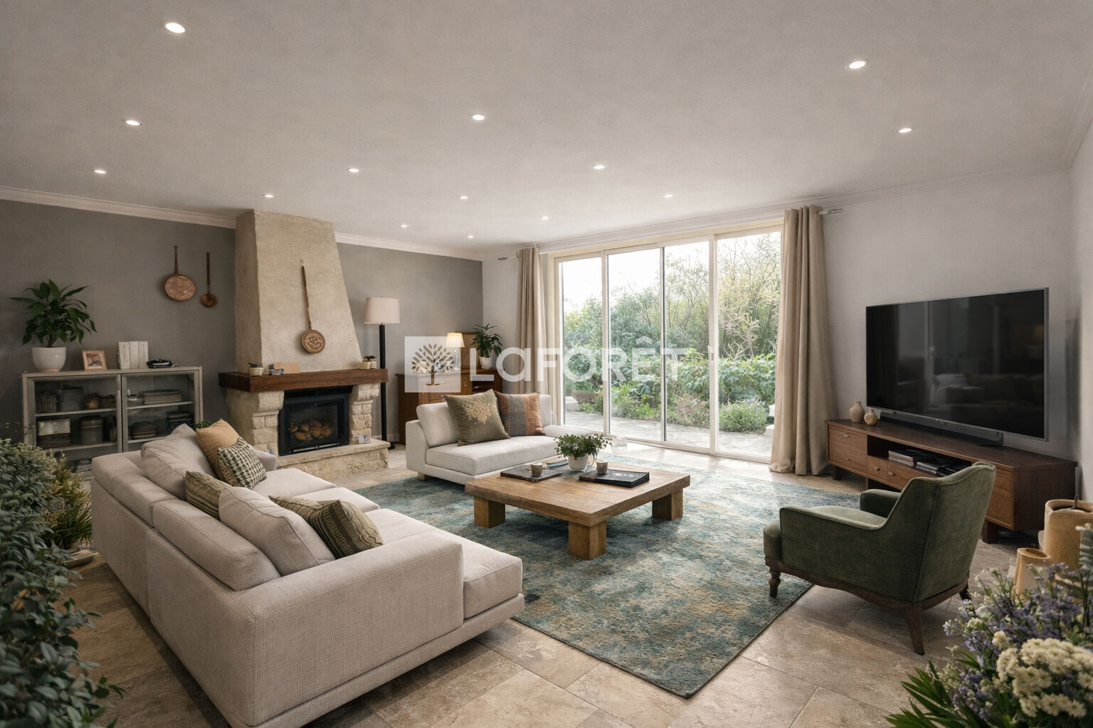 Le rez-de-chaussée s'organise autour d'une vaste cuisine indépendante d'environ 20 m², lumineuse et ouverte sur le jardin, ainsi que d'un séjour spacieux et convivial, agrémenté d'une cheminée et largement tourné vers l'extérieur. Quatre chambres de plain-pied, aux surfaces confortables, complètent ce niveau, accompagnées d'une salle de bains et d'espaces de circulation fonctionnels.