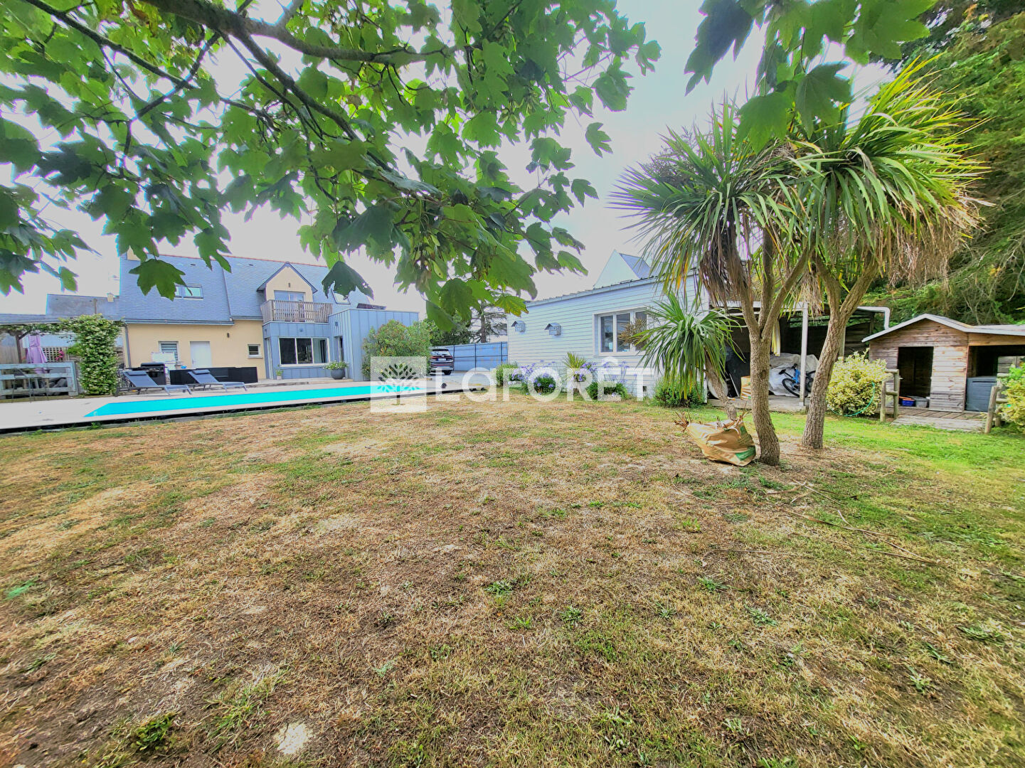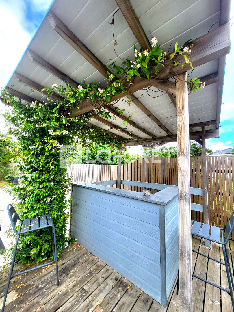 Un jardin clos joliment aménagé avec un grand garage, un espace enfant, une terrasse aménagée avec son bar à cocktail au bord de la piscine pour que chacun y trouve sa place.