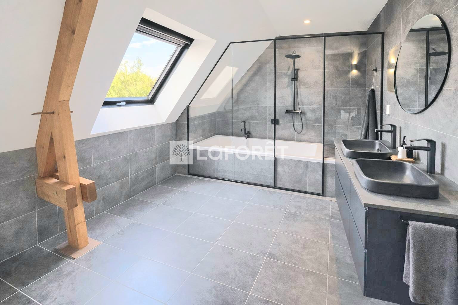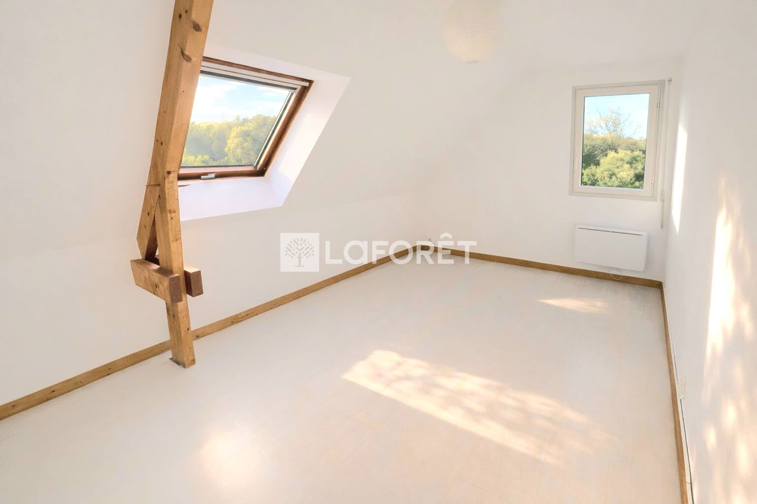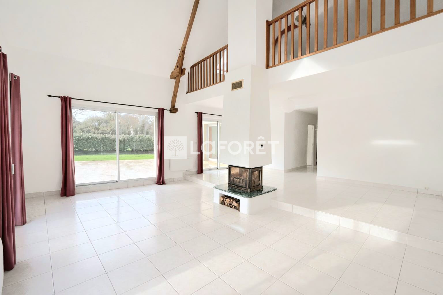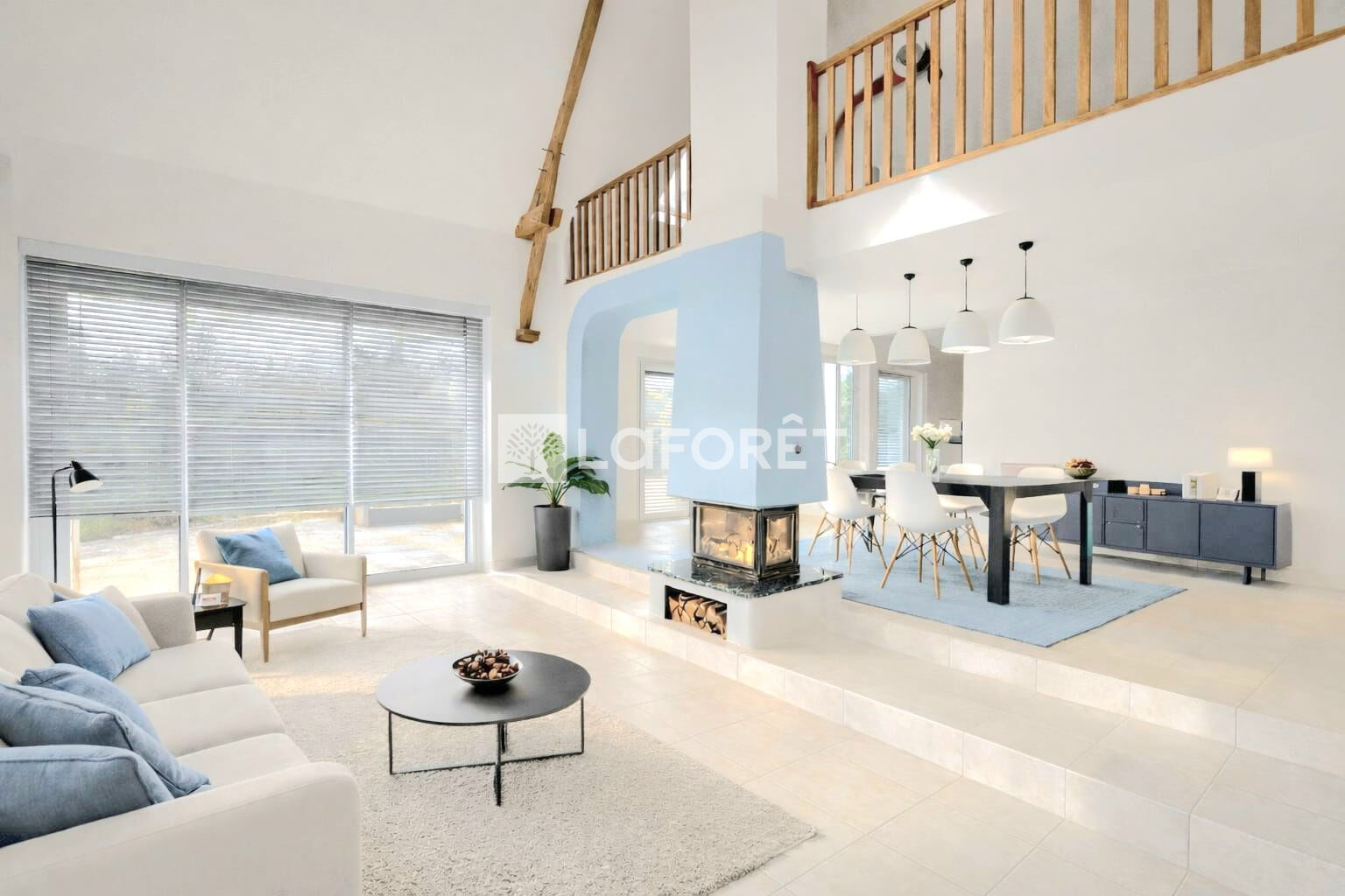 À l'intérieur, les volumes sont REMARQUABLES. Le SÉJOUR CATHÉDRALE, baigné de lumière naturelle, est mis en valeur par des poutres apparentes qui donnent immédiatement du caractère à l'ensemble.