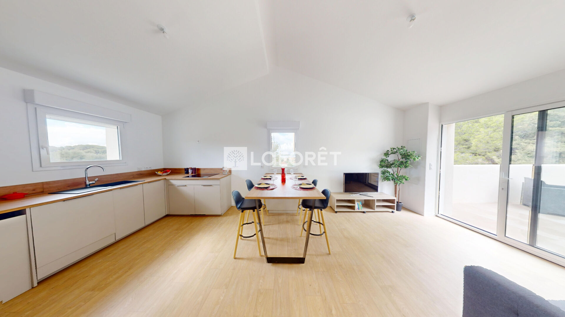 L'appartement propose une belle pièce de vie lumineuse avec cuisine ouverte, pensée pour la convivialité, ainsi que deux chambres, dans un esprit moderne et chaleureux