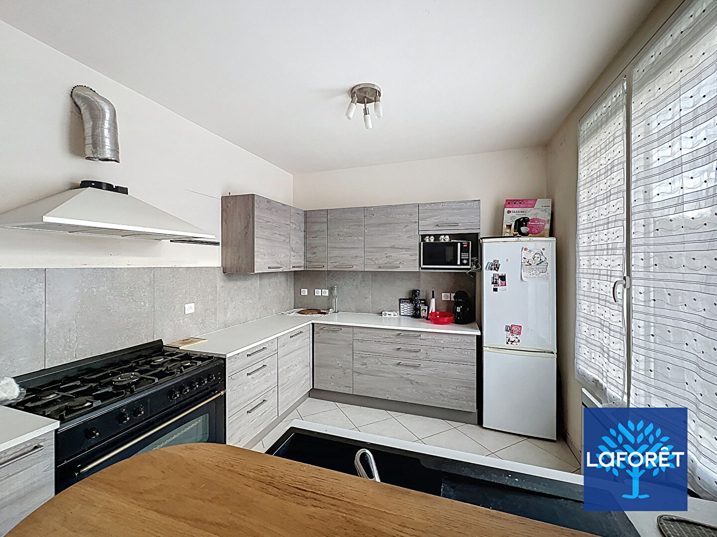 Vous découvrez une cuisine de 15m² ouverte sur le séjour avec cheminée insert, donnant sur la terrasse. Le dégagement dessert la chambre et une salle d'eau, wc séparés.