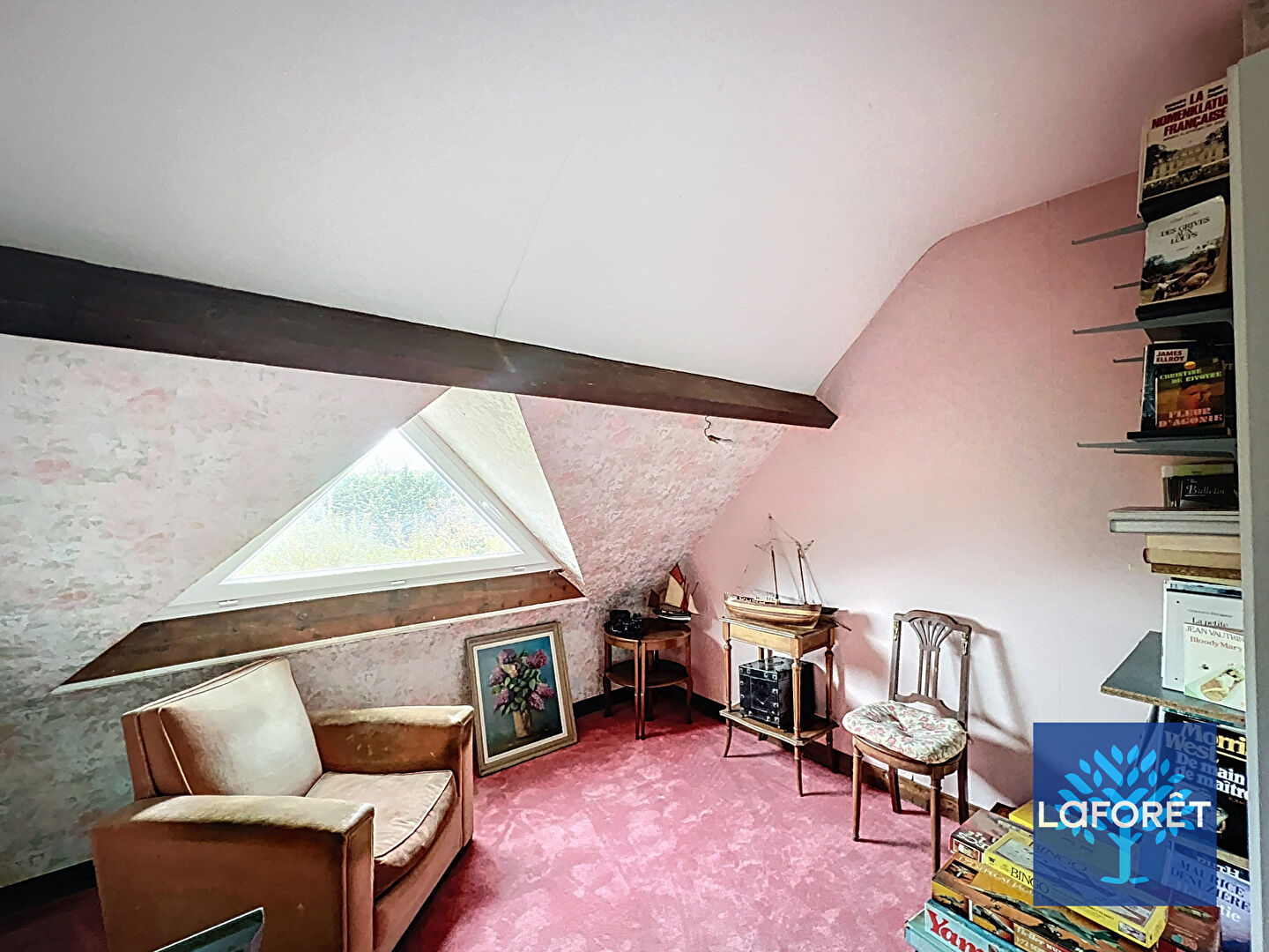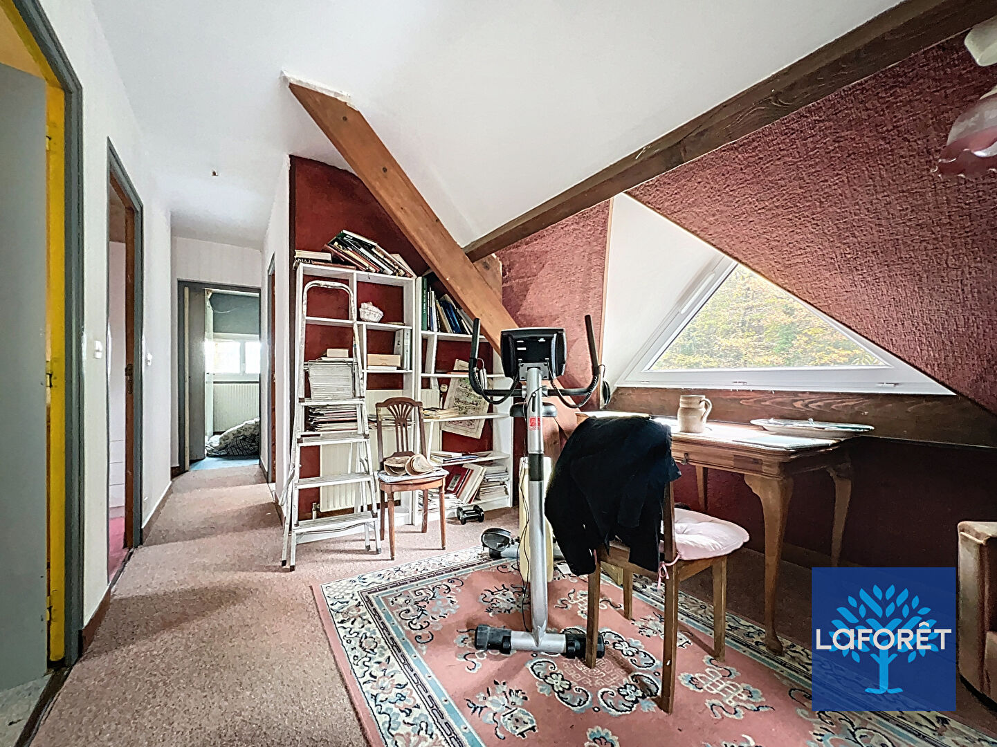 Vous découvrez, une entrée, un bureau, wc, cuisine, séjour de 44m² avec cheminée centrale.