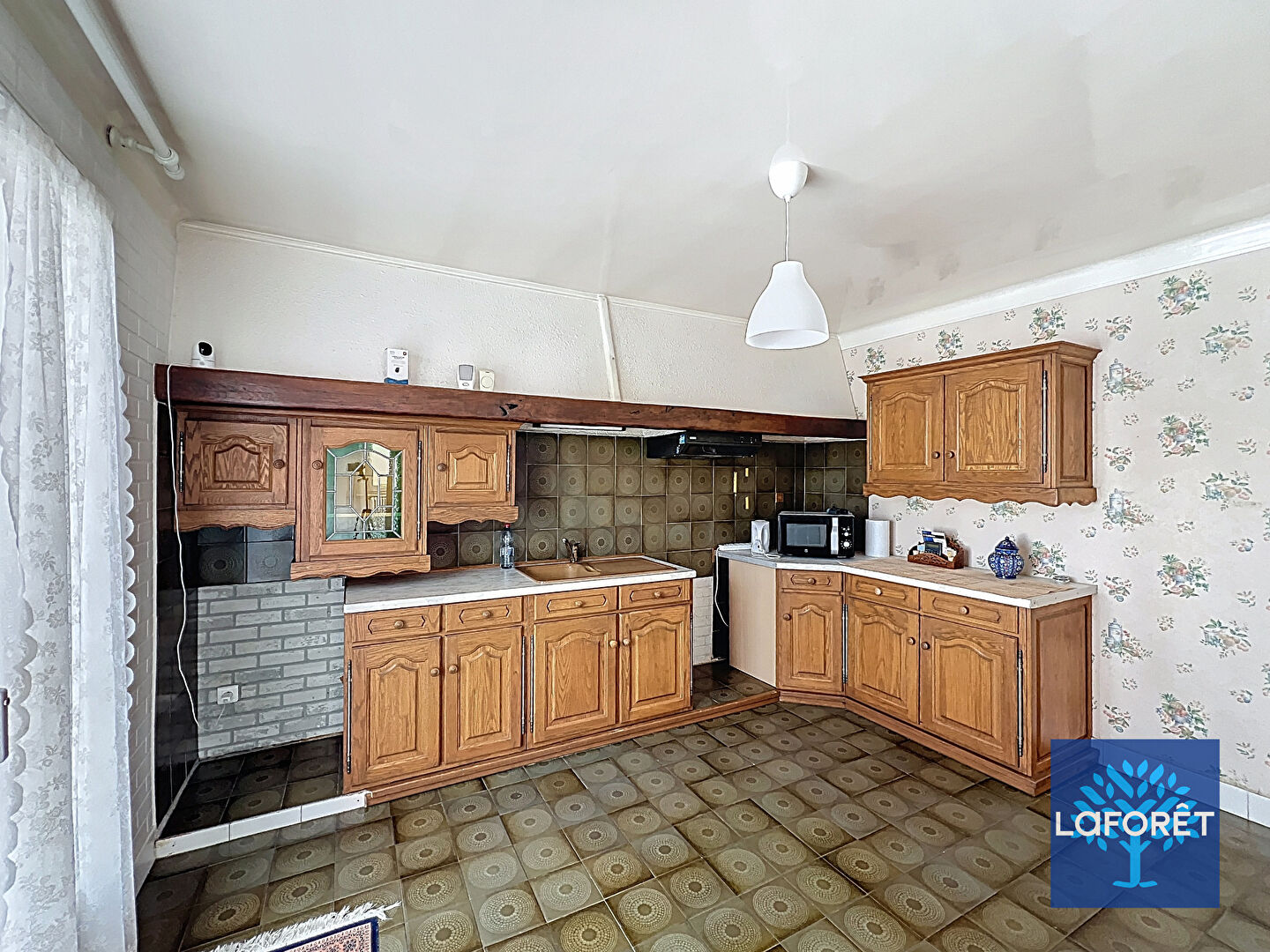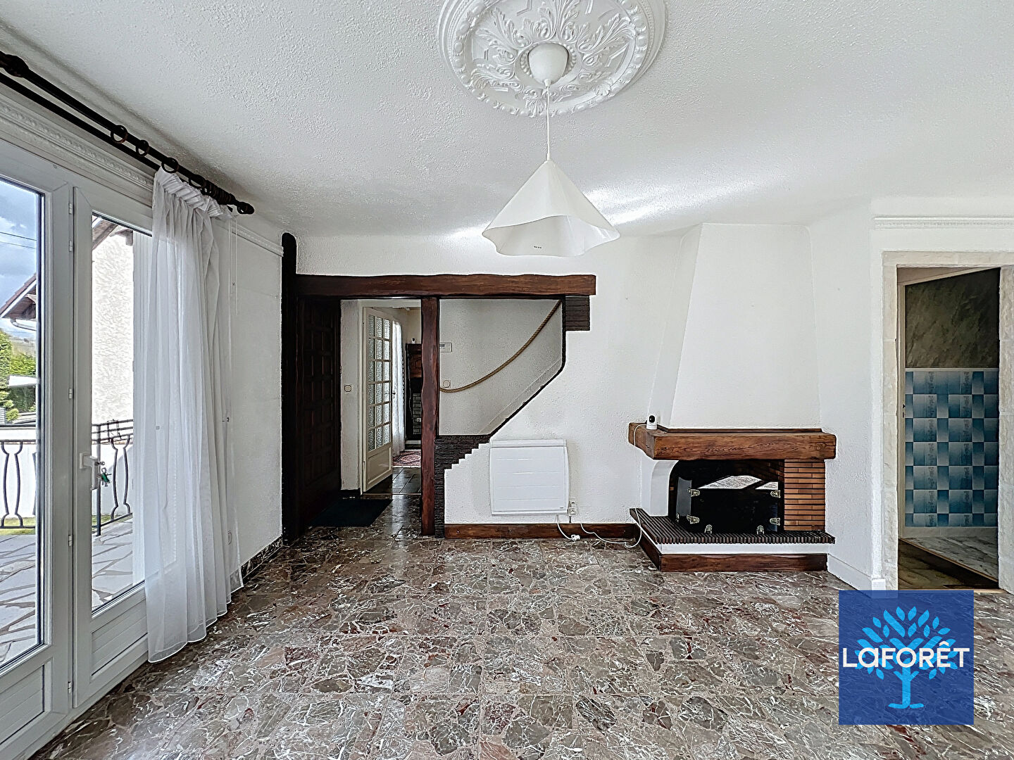Vous trouverez un sas d'entrée donnant accès au séjour traversant de 30m² avec cheminée, une cuisine avec un accès direct à la terrasse, une chambre, une salle d'eau et WC séparés.