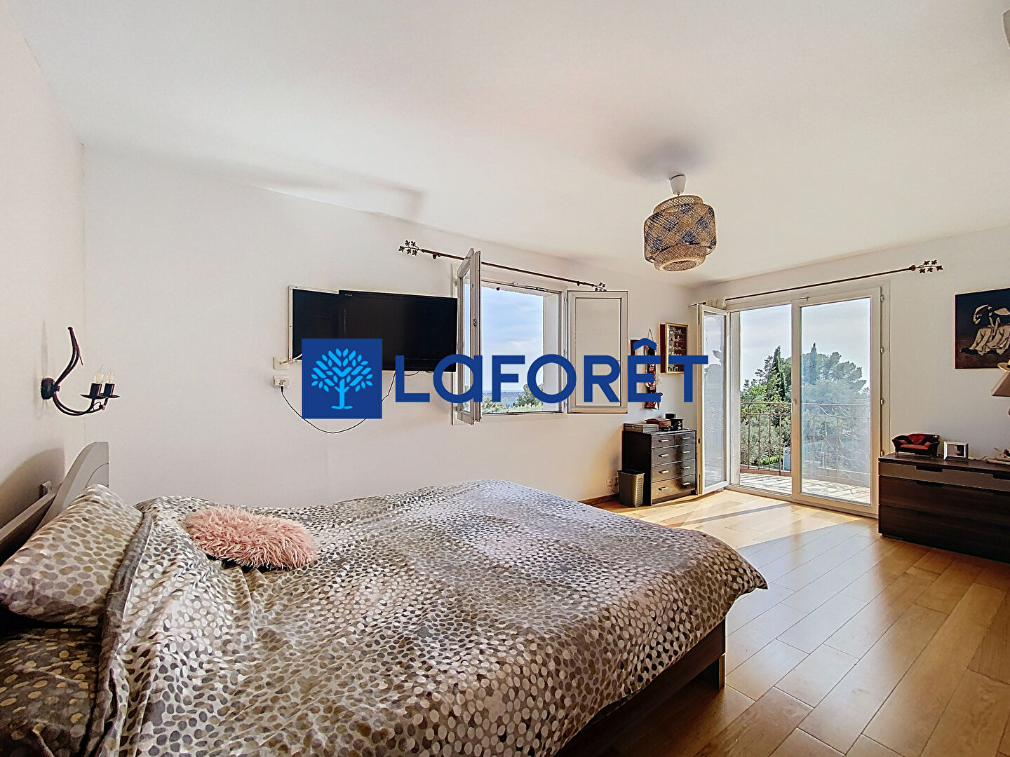A l'étage, une chambre de 18m² avec salle d'eau, une seconde suite parentale de 24m² avec salle de bains, dressing et balcon privatif vue mer et piscine.