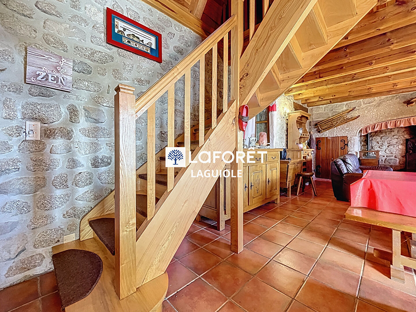 L'intérieur où la pierre et le bois dominent, dégage une ambiance apaisante.