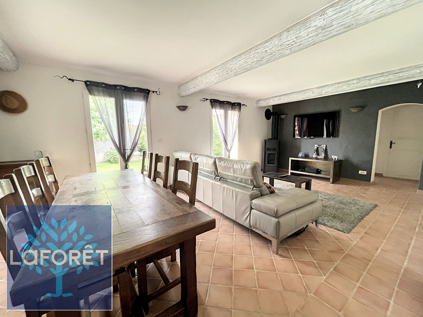 COTE MAISON au Rez-de-chaussée : une vaste pièce de vie lumineuse, comprenant un salon/salle à manger avec poêle à granulés, et une belle cuisine dinatoire.
