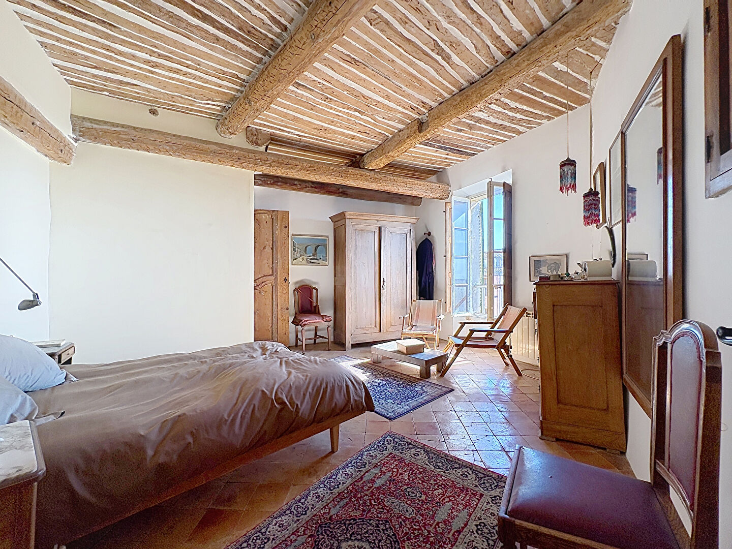 Premier étage : bel espace avec pièce de vie spacieuse, une chambre avec magnifique plafond à la française et salle de bain, pouvant également être indépendant.