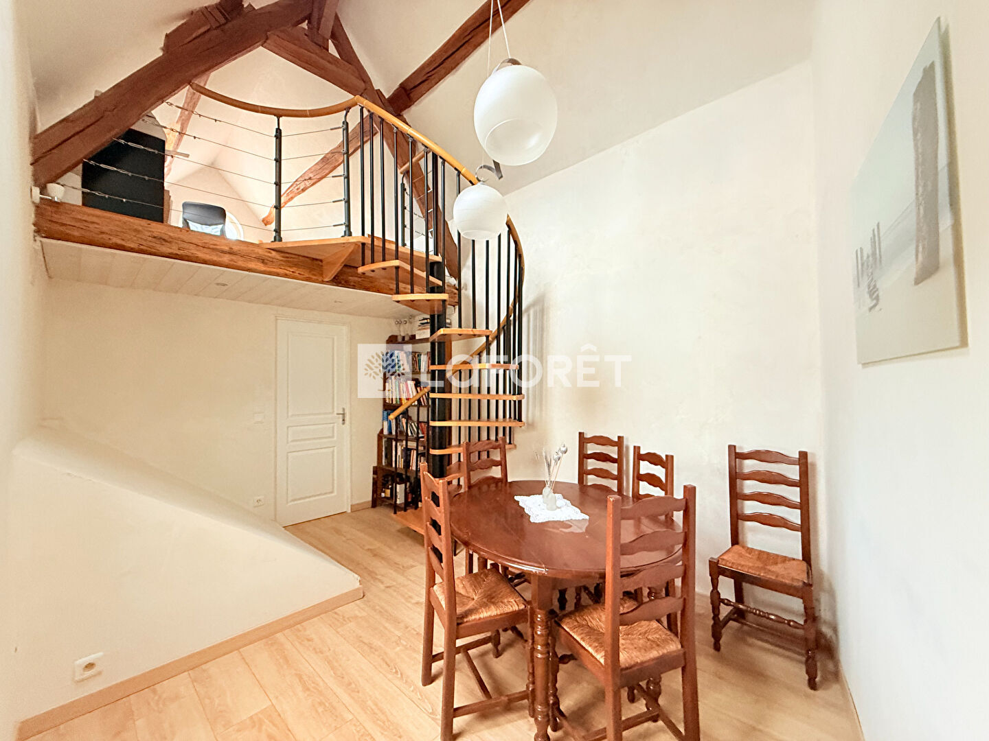 Elle se compose, au rez-de-chaussée, d'une entrée, d'une cuisine aménagée et équipée, d'un double séjour / salle à manger lumineux, agrémenté d'une mezzanine pouvant servir de bureau ou chambre d'ami, ainsi que d'un WC.