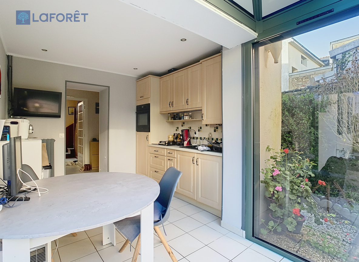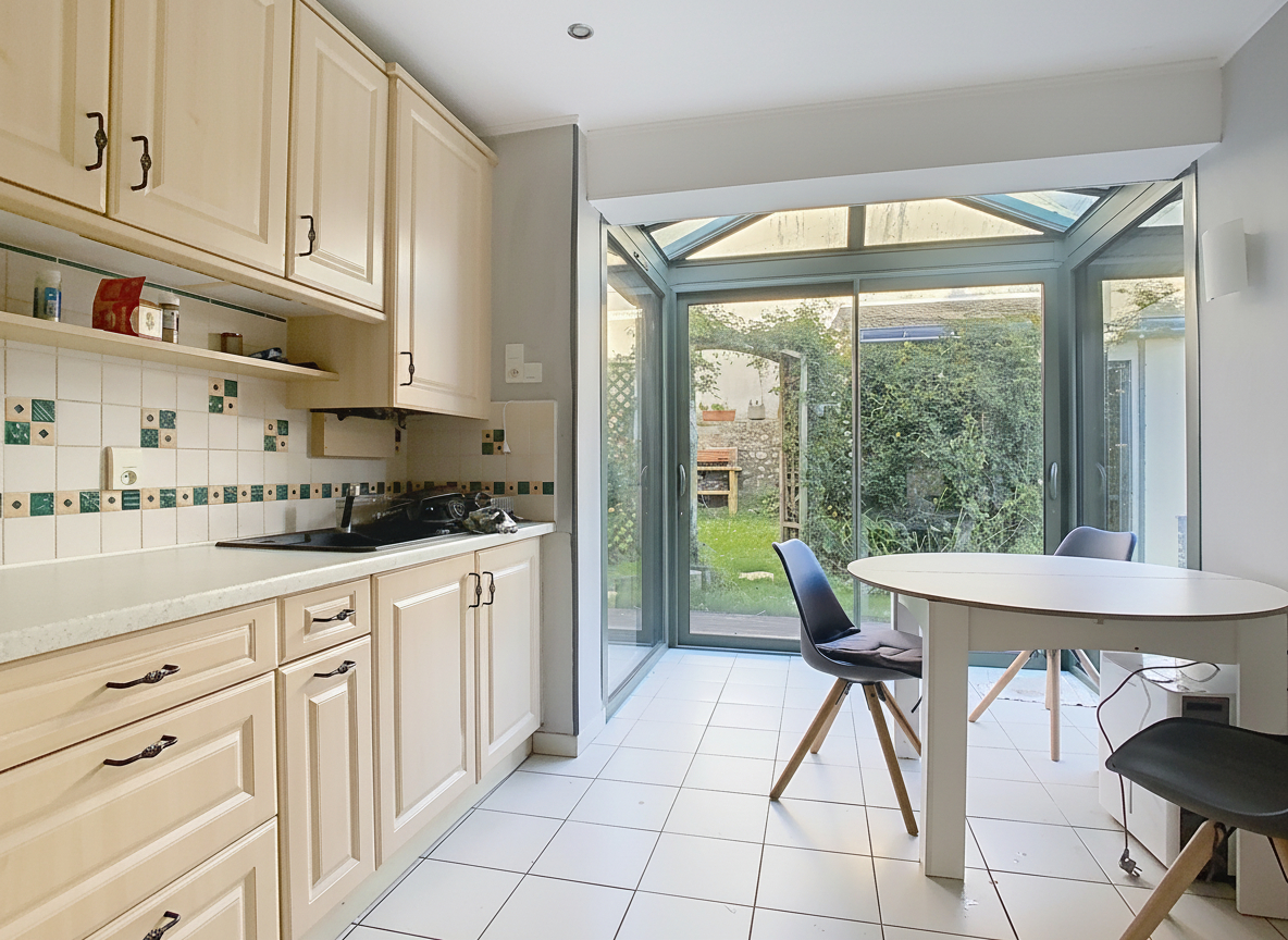 Agréable cuisine prolongée d'une verrière donnant sur un jardin clos.