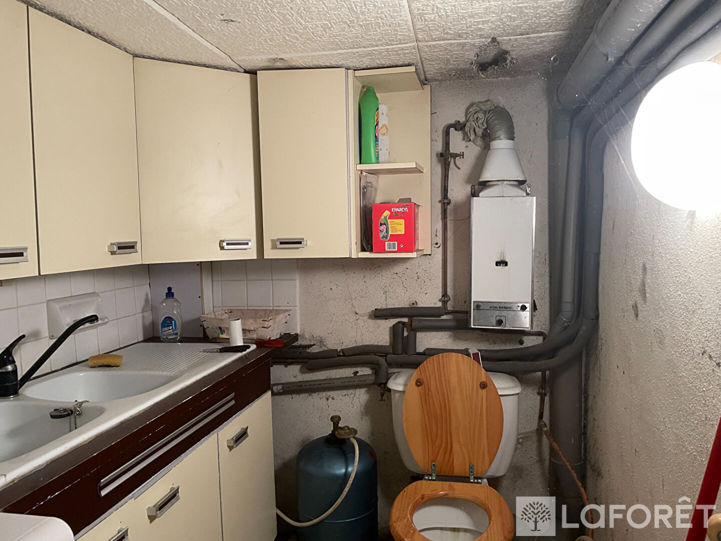 Une buanderie avec WC, un garage et une cave offrant de beaux espaces de rangement.