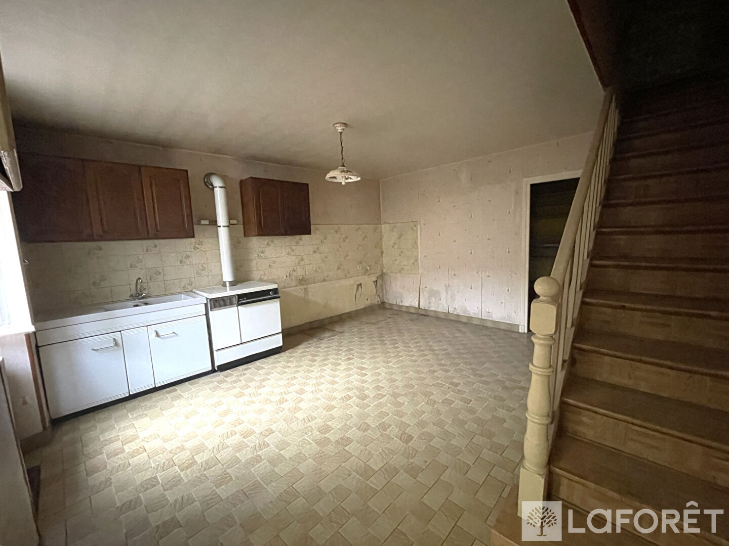 une cuisine avec arrière-cuisine, un salon chaleureux et un WC indépendant.