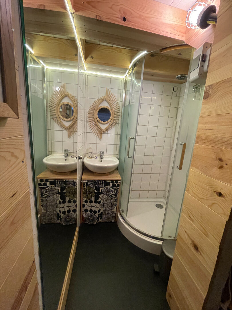 Une maison principale avec cuisine, salon, salle d'eau et WC au rez-de-chaussée ; deux chambres et coin bureau à l'étage ; combles aménagés en bibliothèque.