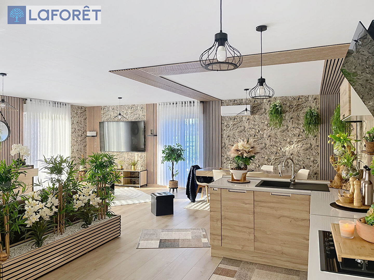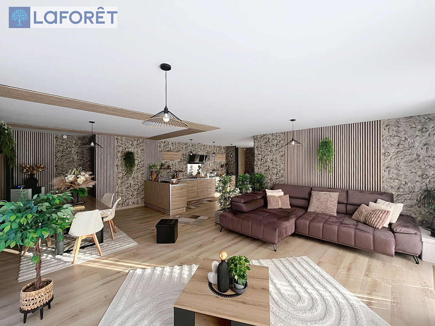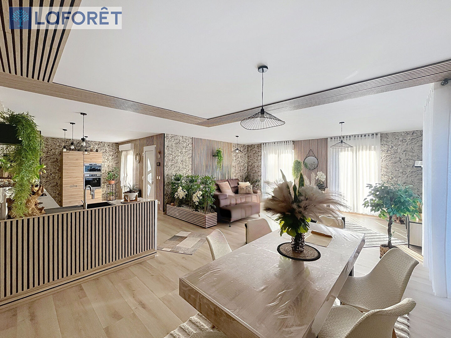 L'intérieur confirme ce niveau d'exigence. La pièce de vie offre des volumes exceptionnels. Salon, séjour et cuisine se fondent dans un espace unique où chaque matière et chaque texture créent une atmosphère chaleureuse et actuelle. Le bois, les lignes verticales, les teintes naturelles et le mobilier soigneusement choisi donnent une identité forte à l'ensemble. La cuisine intégralement équipée vient compléter cet espace de vie avec cohérence.