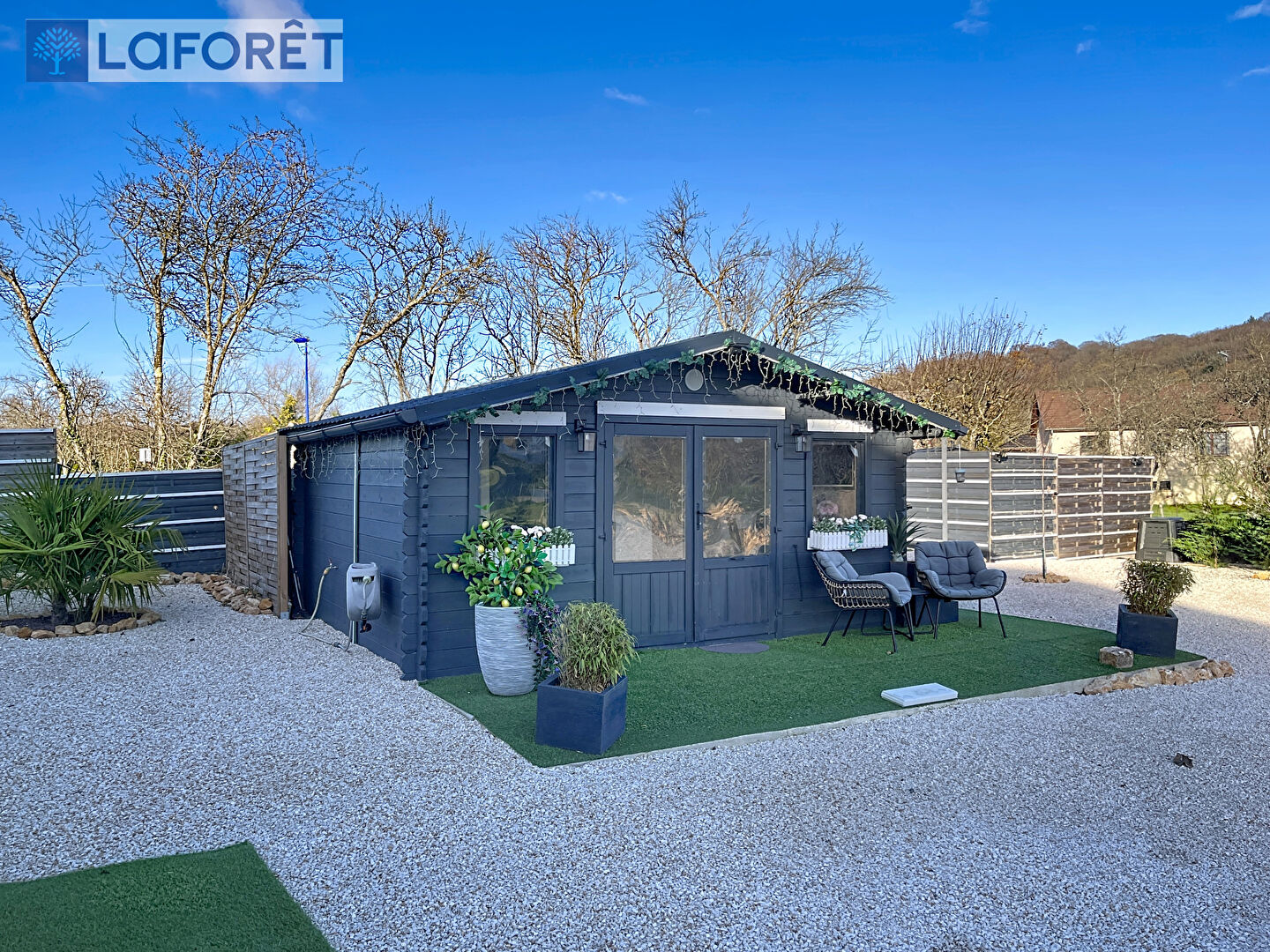 Le terrain, entièrement aménagé en gravier paysager et délicatement arboré, garantit un entretien minimal et un rendu visuel impeccable tout au long de l'année.