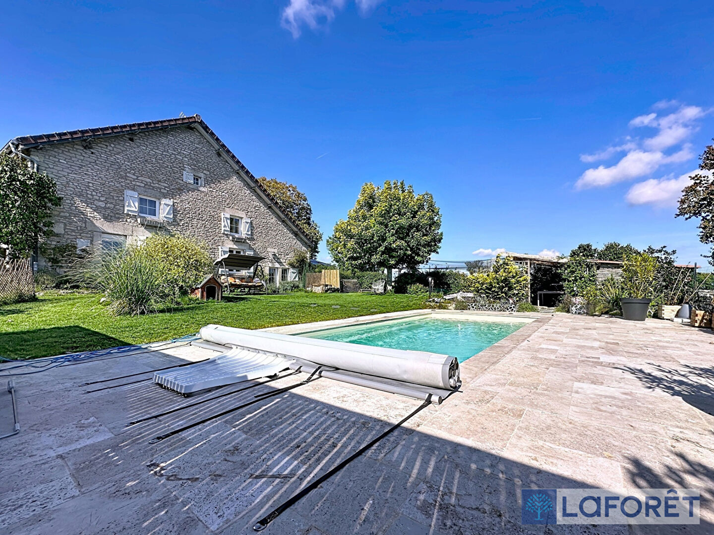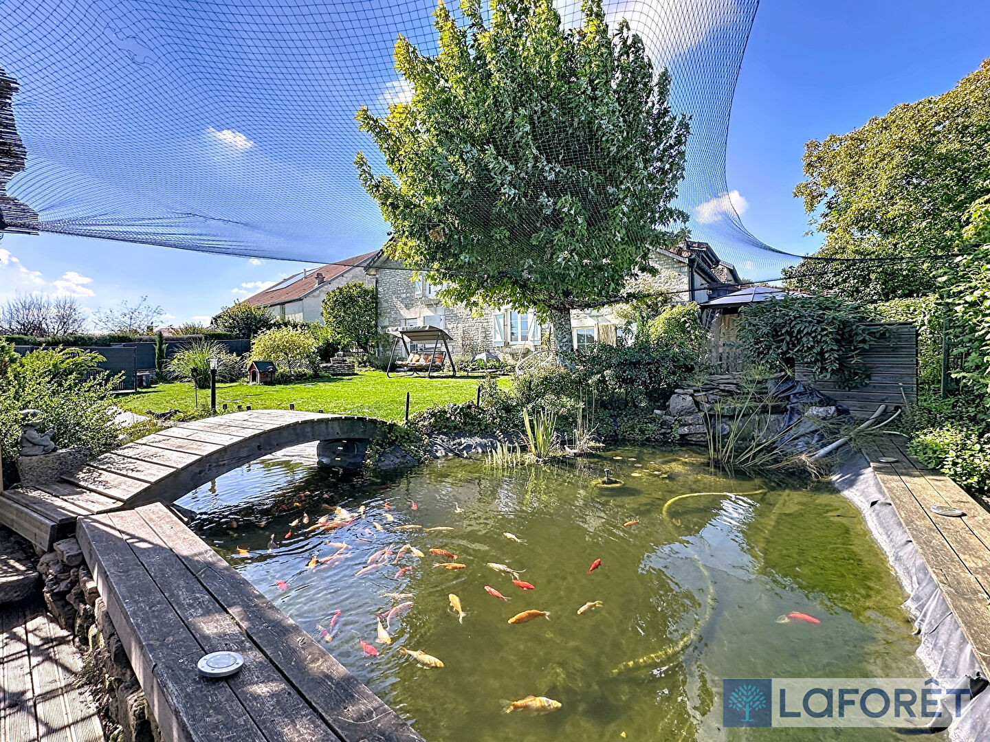 Profitez d'un jardin arboré, idéal pour les moments en famille ou entre amis, agrémenté d'une piscine pour les beaux jours et d'un bassin décoratif qui apporte une touche de charme et de sérénité.