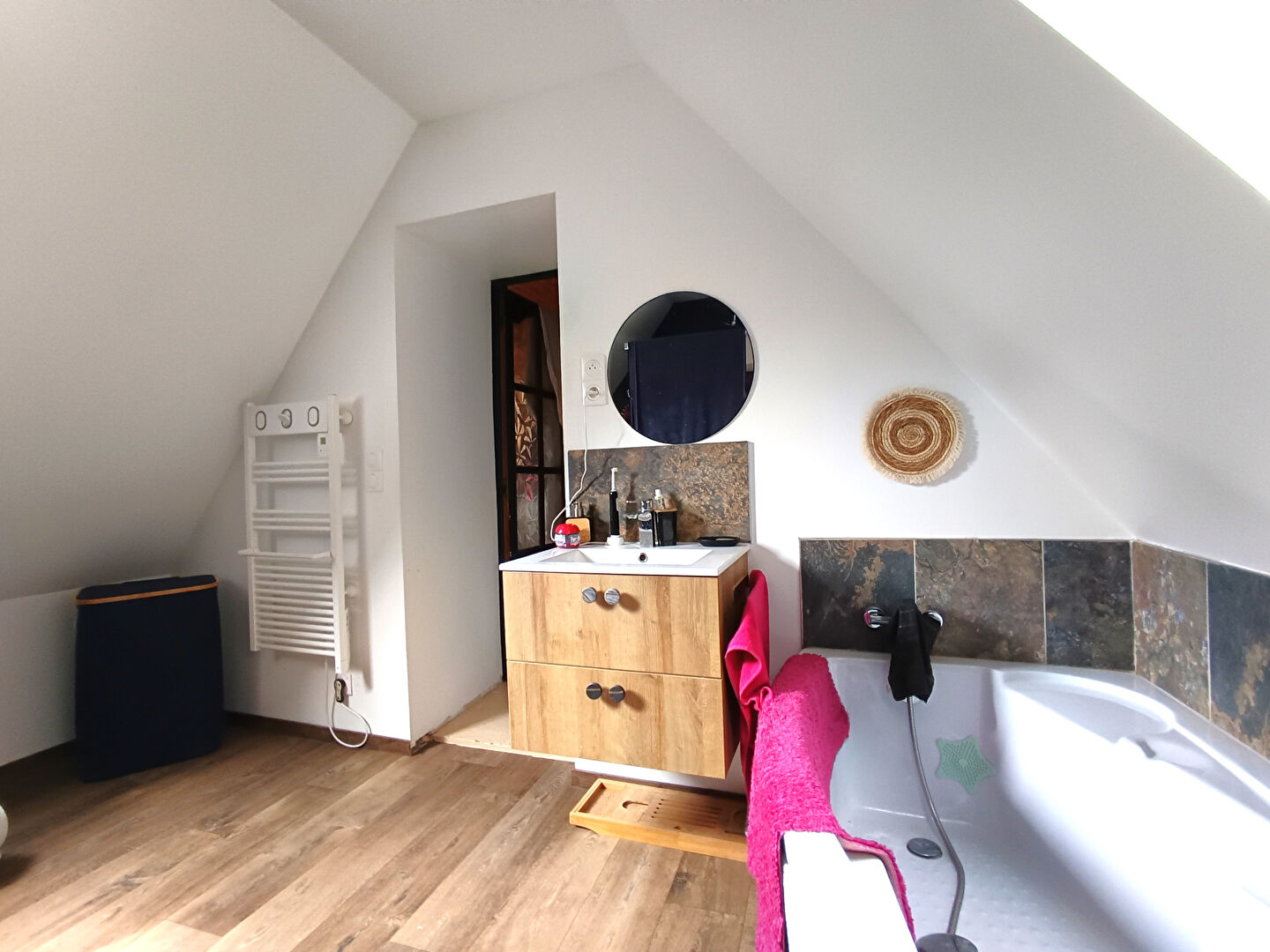 Une cuisine, une buanderie et un WC. A l'étage, un palier, deux chambres et une salle de bain avec douche, baignoire et WC.