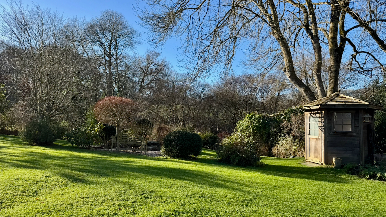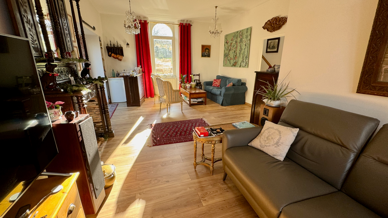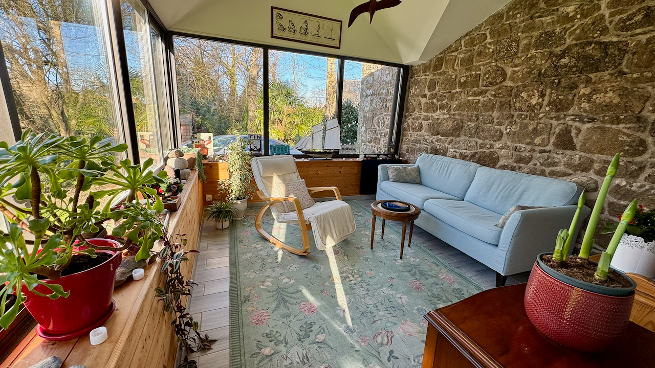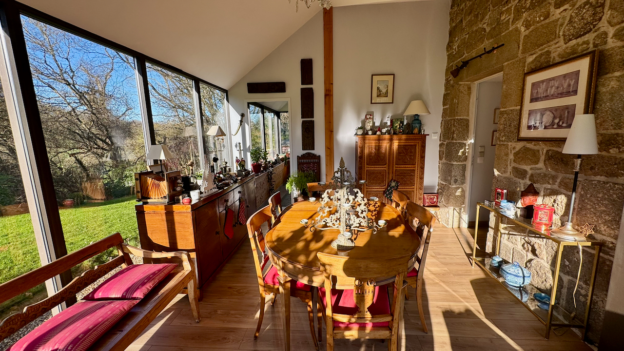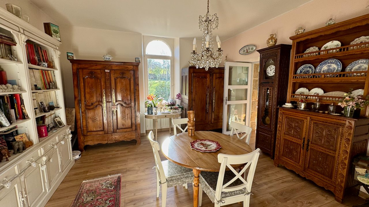 Elle dispose de plusieurs pièces à vivre dont une extension récente offrant une vue sur un jardin aménagé par paysagiste.