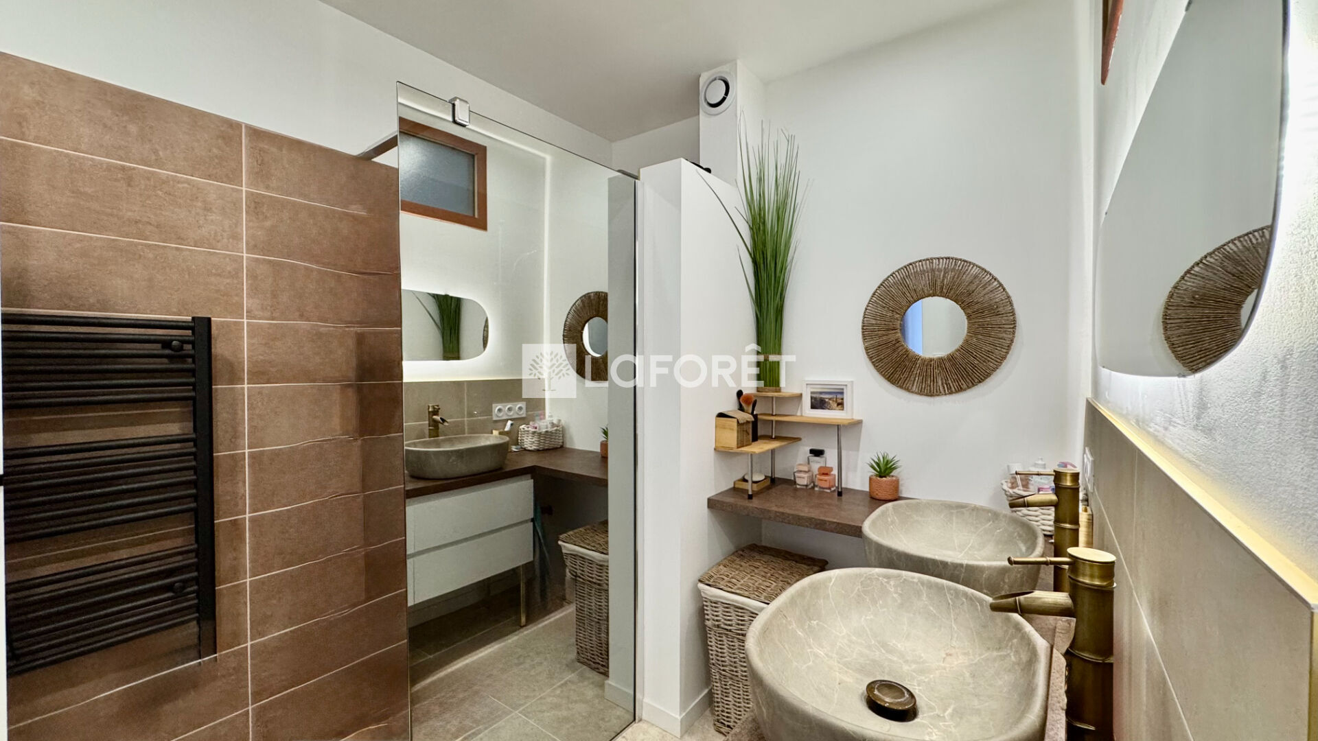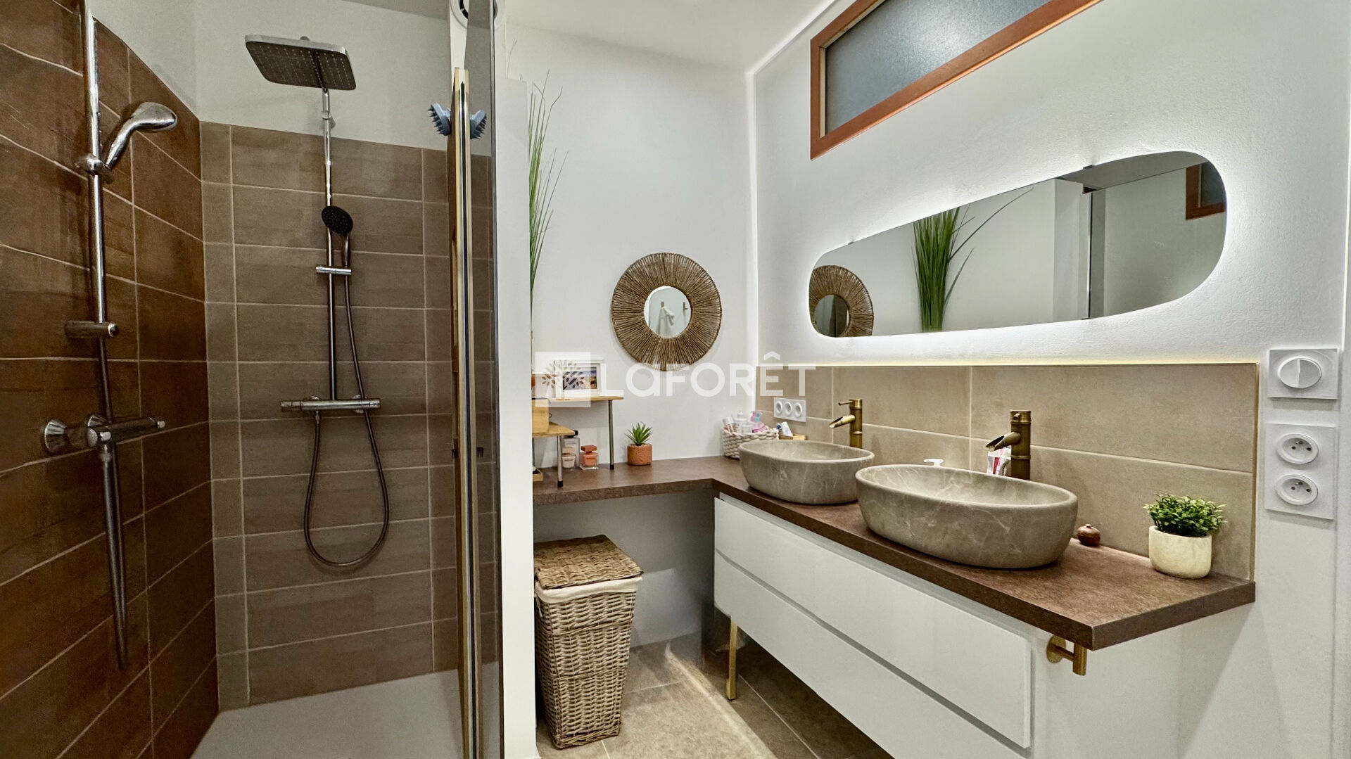 Le 1er étage accueille deux chambres lumineuses et une superbe salle d'eau équipée d'une douche à l'italienne double, offrant un véritable espace de bien-être.