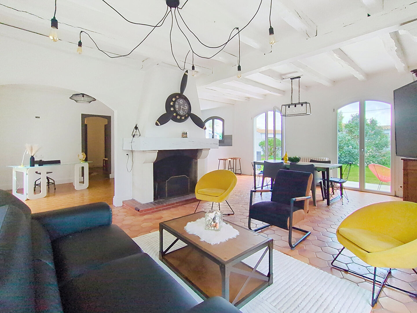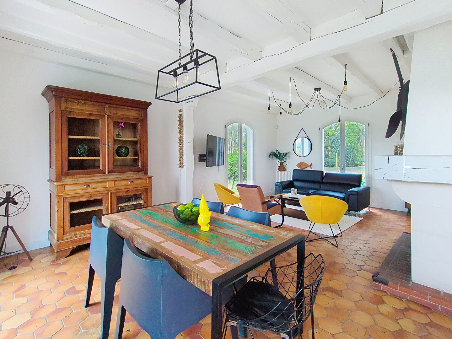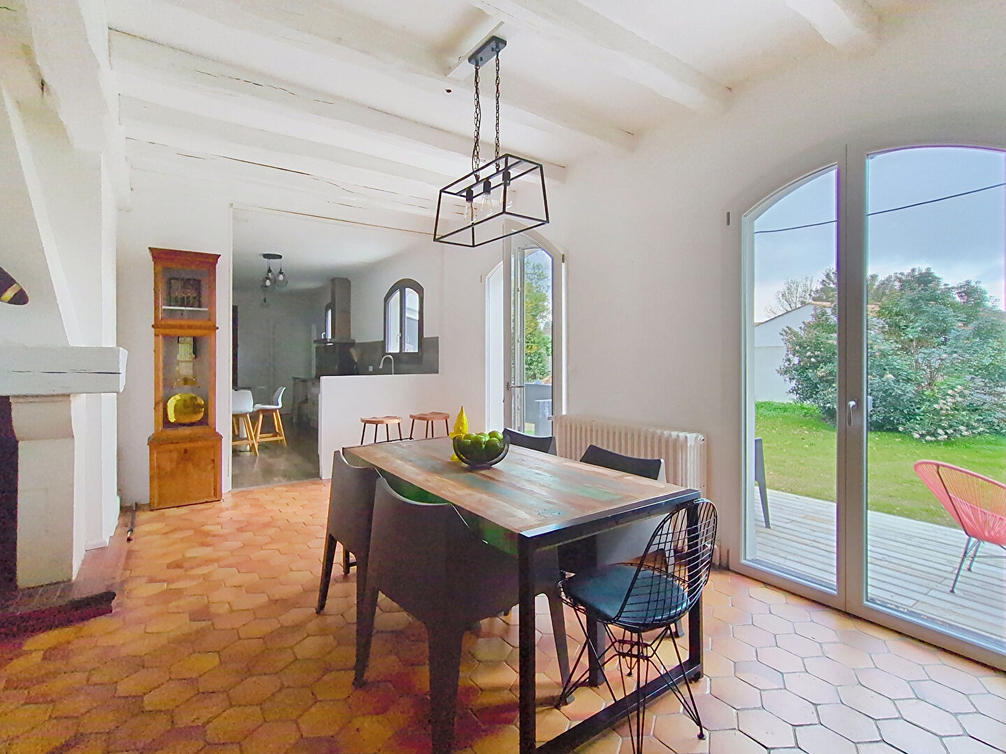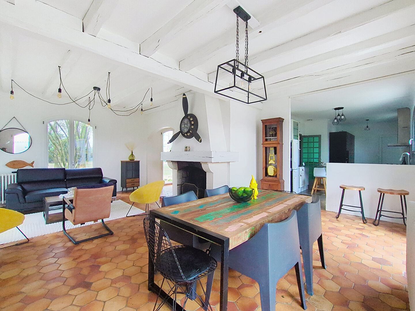 Elle offre une belle hauteur sous plafond qui renforce son charme, ainsi qu'une très belle luminosité grâce à son salon-séjour traversant. Les poutres apparentes et la cheminée à foyer ouvert promettent de belles soirées d'hiver.