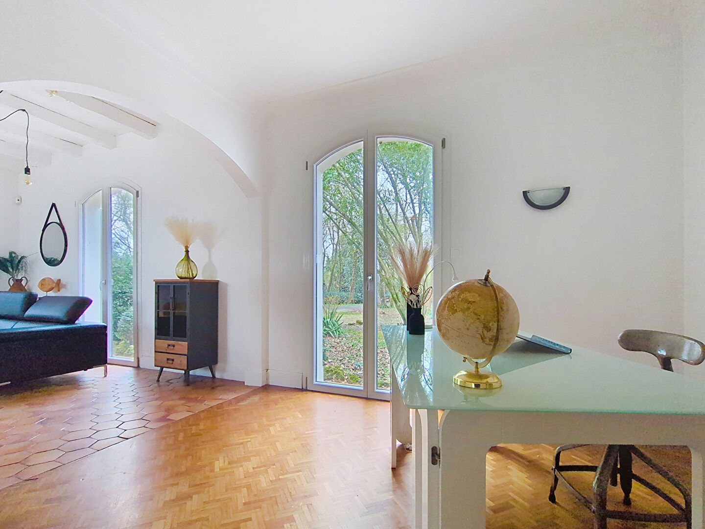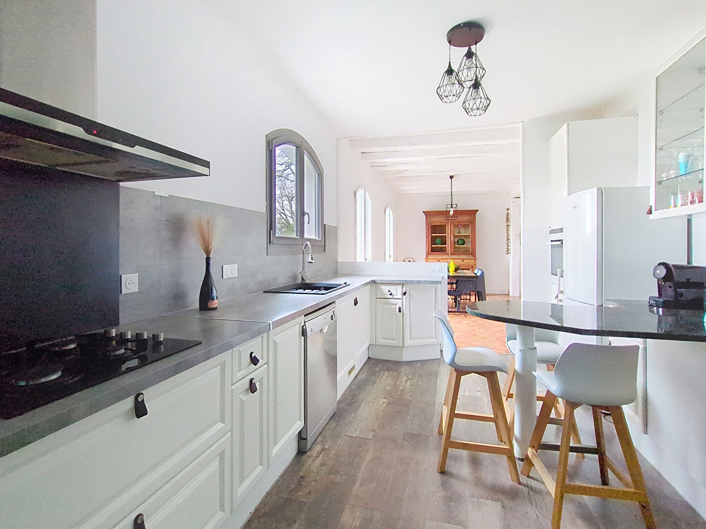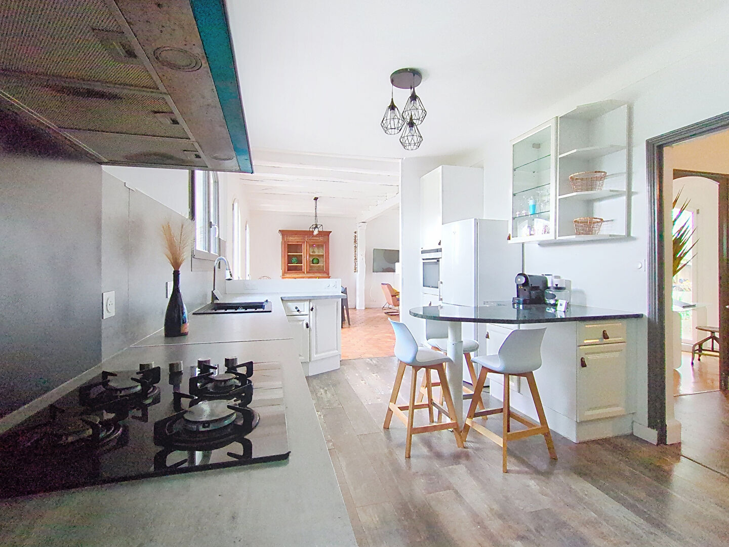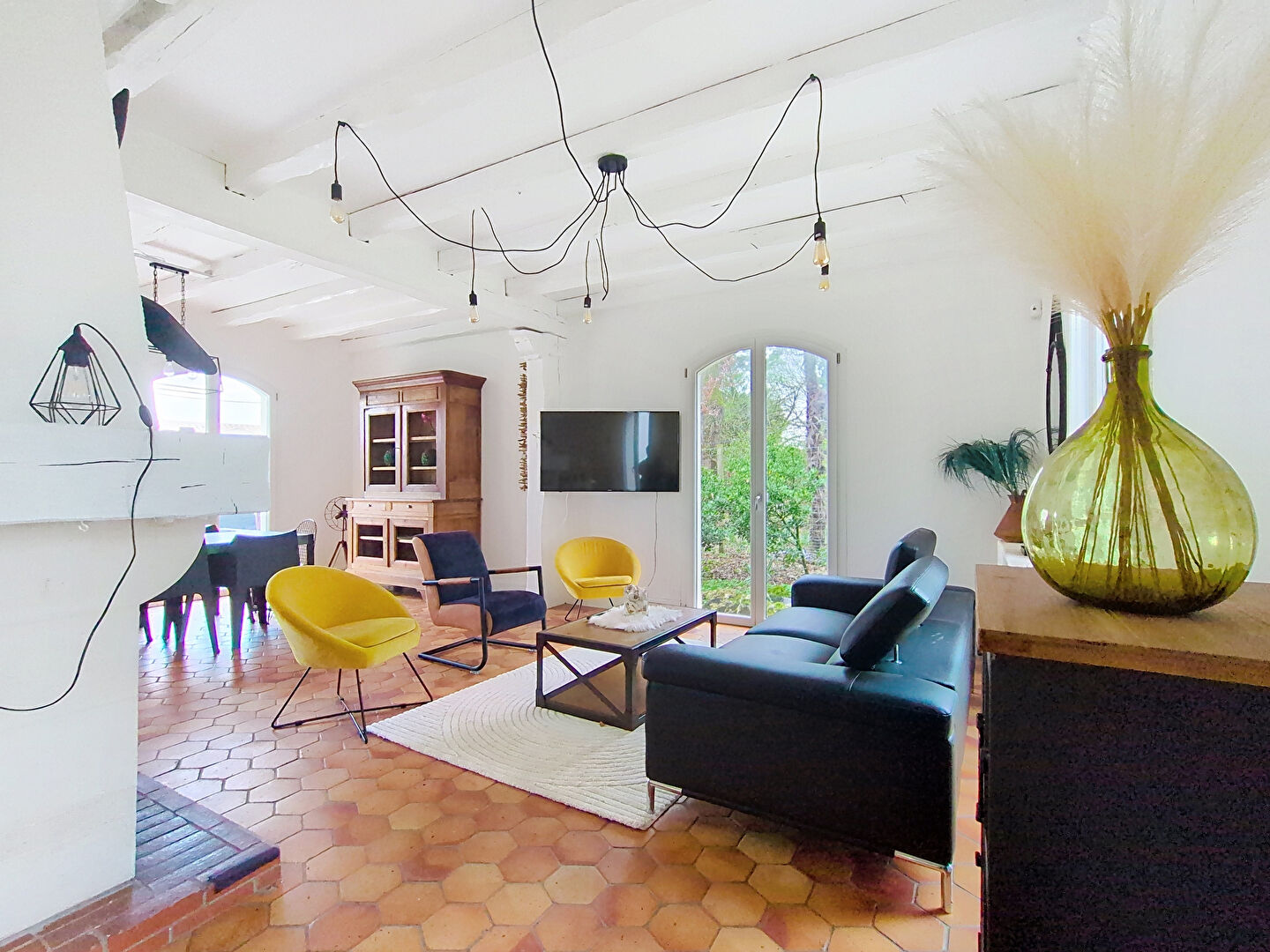 Elle offre une belle hauteur sous plafond qui renforce son charme, ainsi qu'une très belle luminosité grâce à son salon-séjour traversant. Les poutres apparentes et la cheminée à foyer ouvert promettent de belles soirées d'hiver.