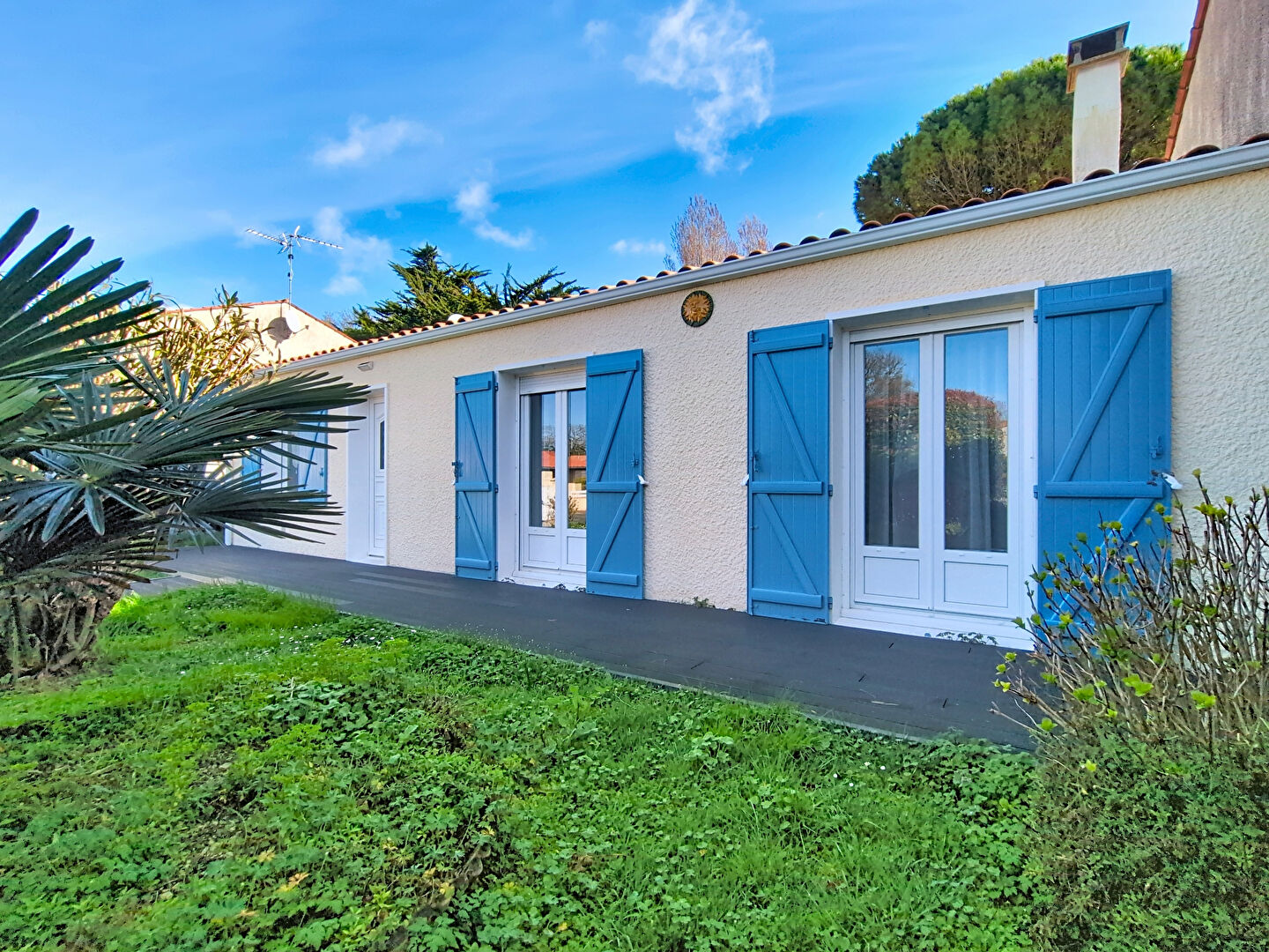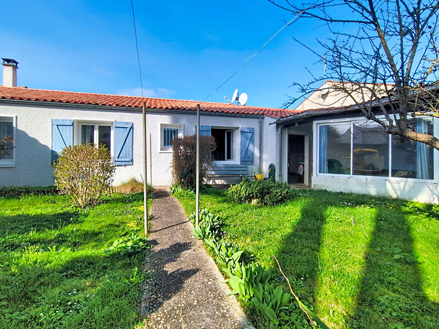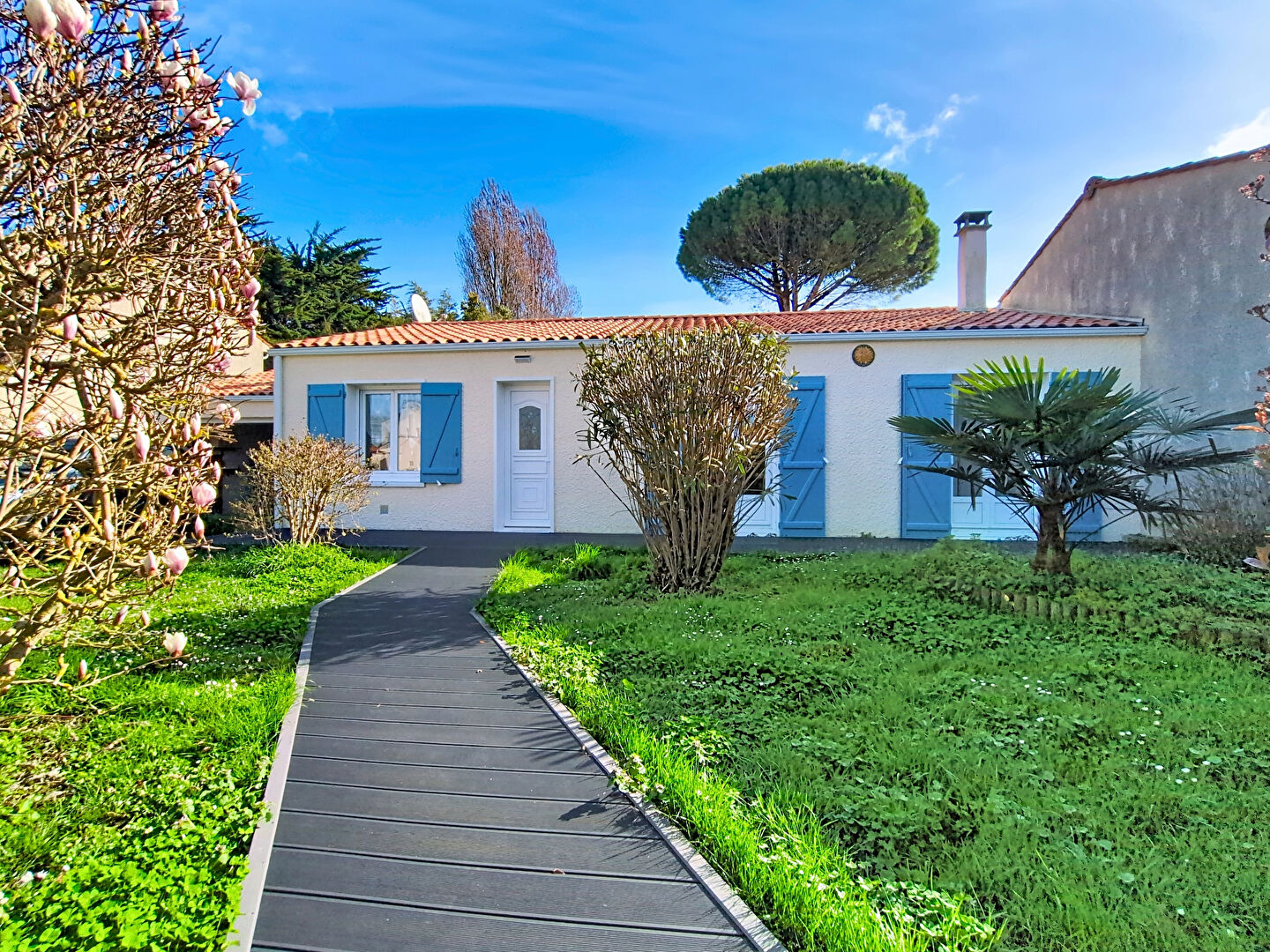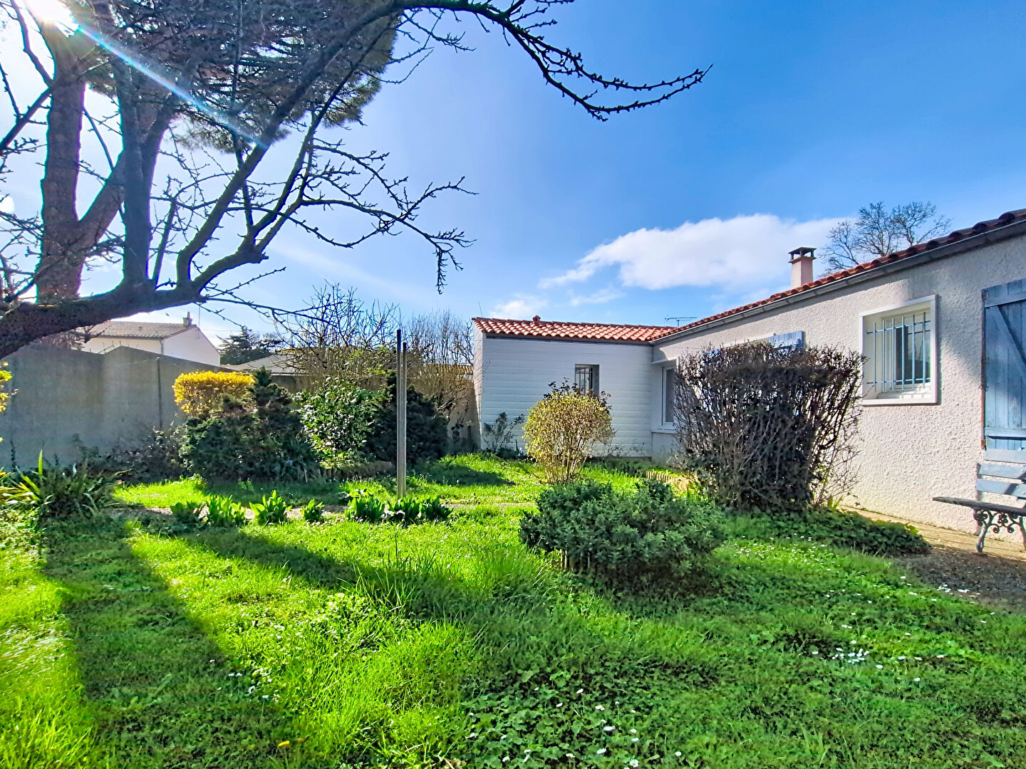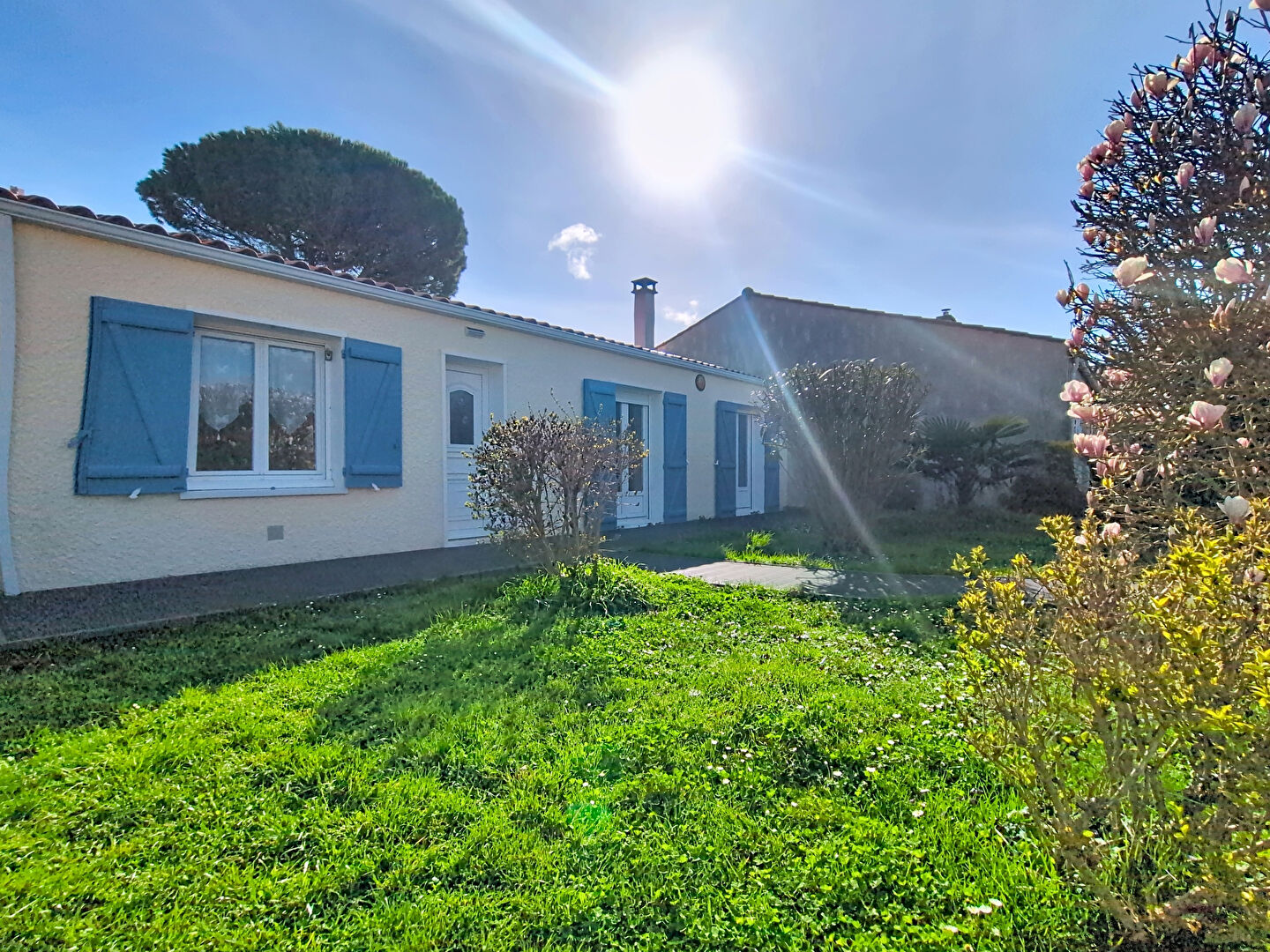 Elle se compose d'une entrée, d'une pièce de vie plein Ouest avec insert, d'une cuisine séparée aménagée et équipée, de 3 chambres dont une suite parentale avec salle d'eau et wc, d'une salle de bains supplémentaire et d'un autre wc. La maison dispose d'un confortable jardin d'accueil paysagé, ainsi qu'une place de stationnement privative sur la parcelle, d'un grand garage avec galetas, et d'un jardin arrière piscinable.