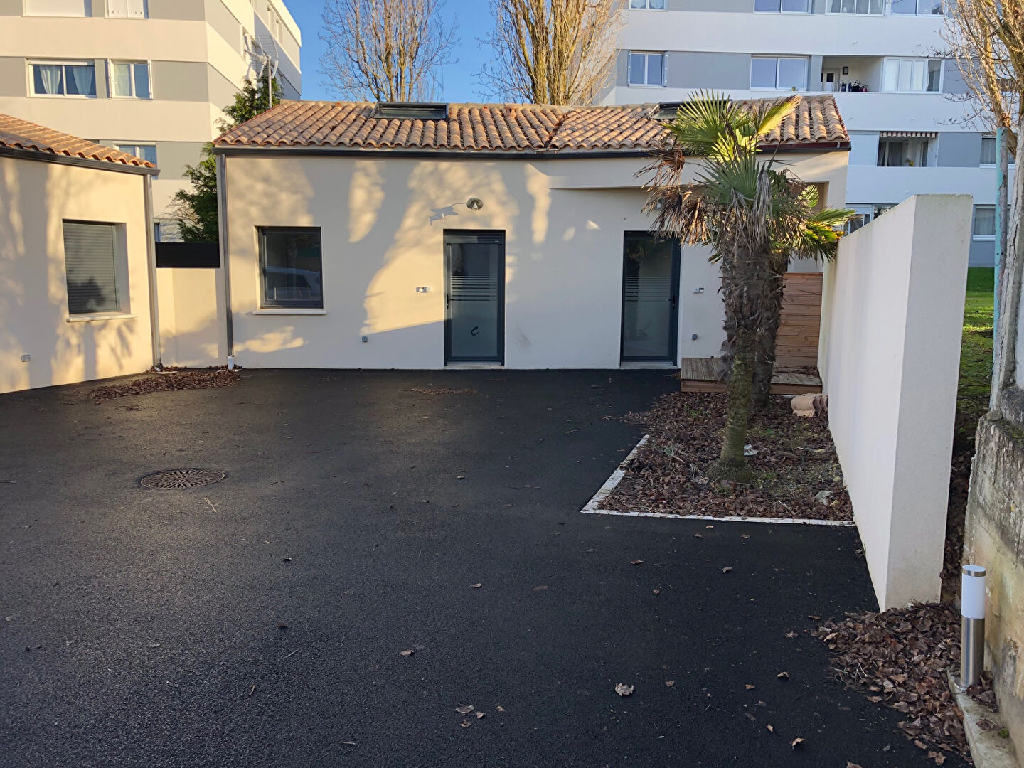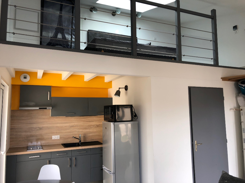 Maison individuelle de 2017 (BBC RT2012) composée d'une pièce de vie avec cuisine ouverte aménagée et équipée, salle d'eau (douche à l'italienne), WC, chambre en mezzanine, une terrasse, une place de parking privative et un local à vélos.