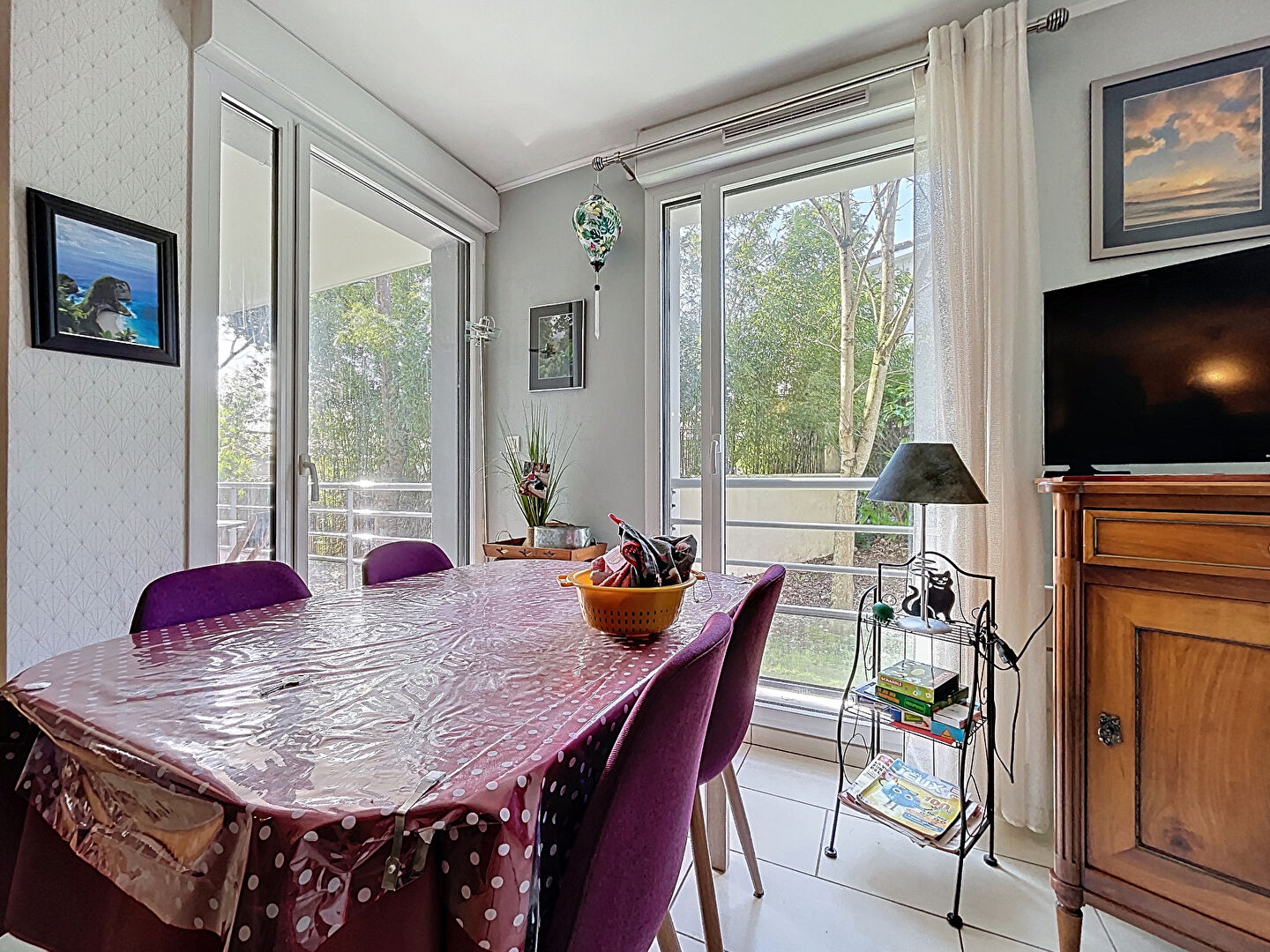 L'appartement se compose d'une belle pièce de vie avec cuisine aménagée et équipée ouverte, offrant un espace convivial et fonctionnel. Le séjour donne accès à une agréable terrasse, également accessible depuis la chambre, permettant de profiter pleinement du calme et du cadre arboré de la résidence.