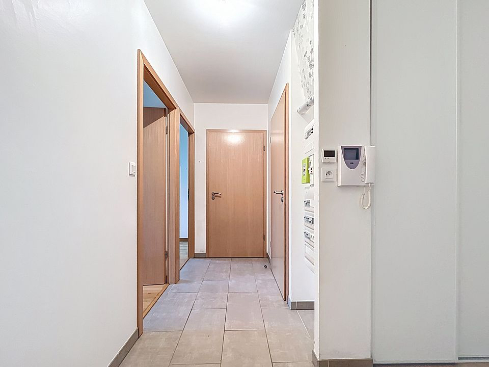 Une entrée avec couloir et placards de rangement
