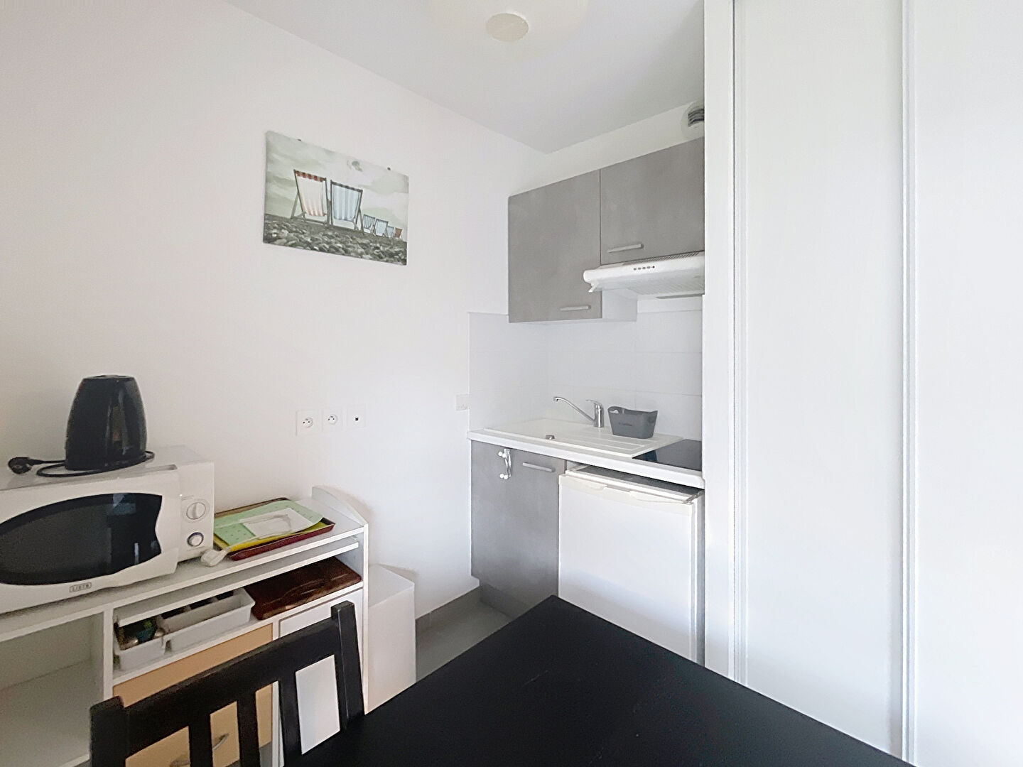 Il se compose d'une entrée avec placard, d'un séjour lumineux avec canapé lit, kitchenette ouverte aménagée et équipée (plaque, hotte, frigo), ainsi que d'une salle de bains avec WC.