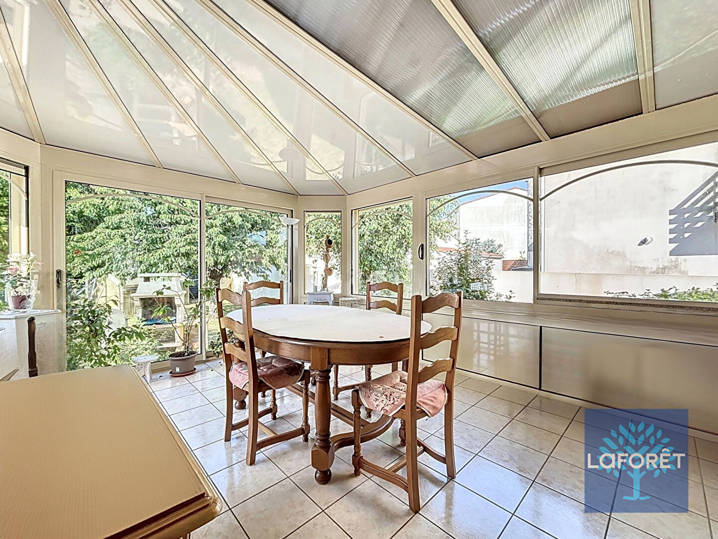 Une grande véranda chauffée, véritable pièce de vie supplémentaire, ouverte sur le jardin,