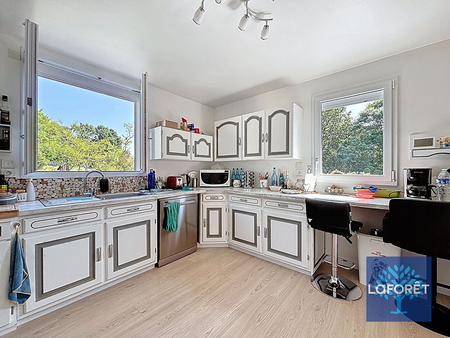 - 1 cuisine neuve entièrement équipée ouverte sur une grande salle à manger, très lumineuse.