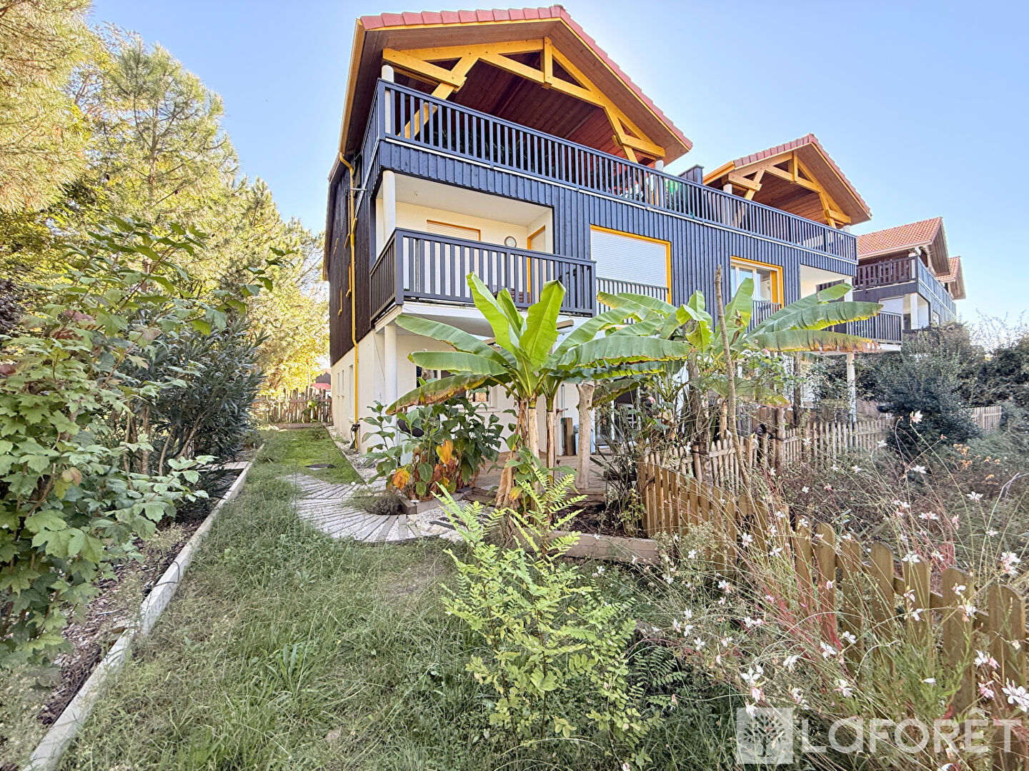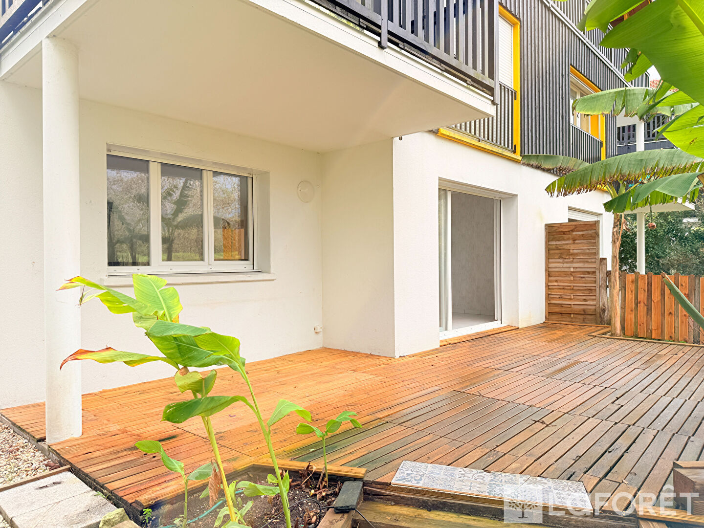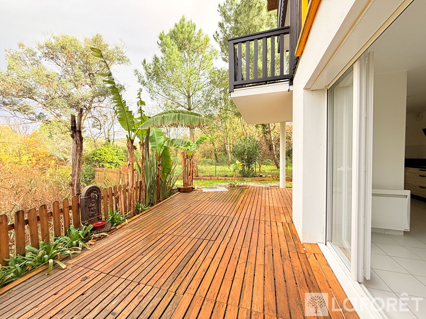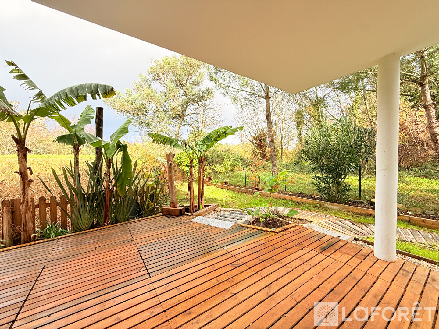 Côté extérieur, une grande terrasse semi-couverte et son jardin en lisière de forêt. Tout est fait pour être à l'abri des regards, dans un écrin de verdure.