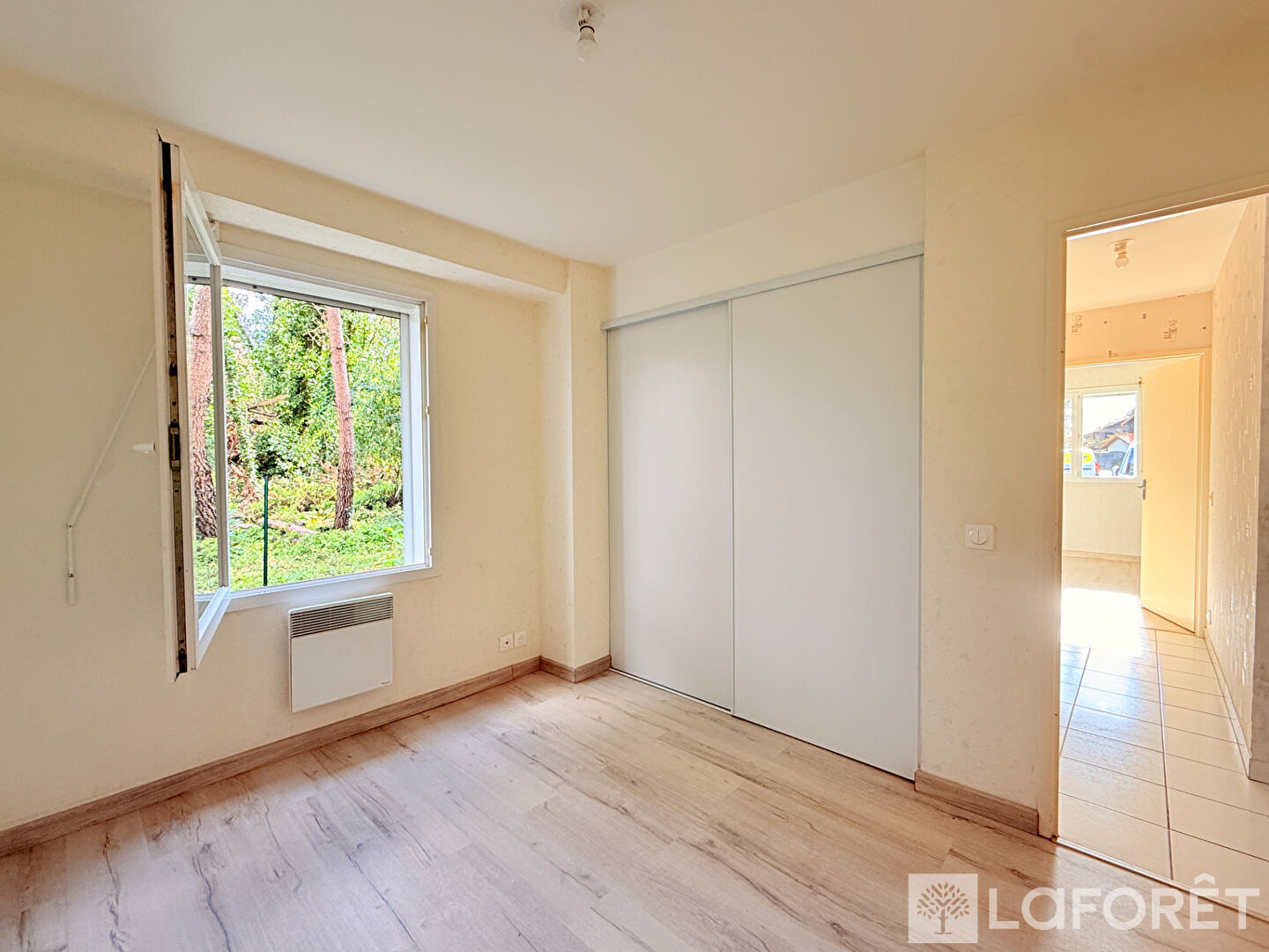 Dès l'entrée, vous pénétrez dans une pièce de vie spacieuse et lumineuse, ouverte sur une cuisine aménagée et équipée, avec vue sur la terrasse, les prés salés et la forêt. Un dégagement vous mène aux deux chambres avec placards intégrés, à une salle d'eau moderne et à un wc avec lave-mains.
