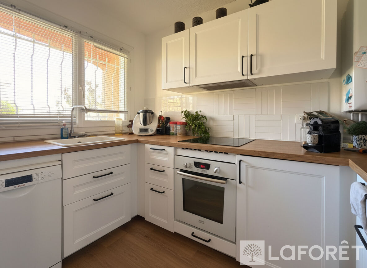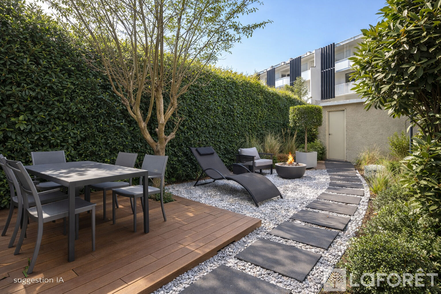 L'entrée s'ouvre sur un séjour donnant directement accès au jardin orienté plein ouest. La cuisine indépendante, moderne et équipée, complète l'espace de vie.