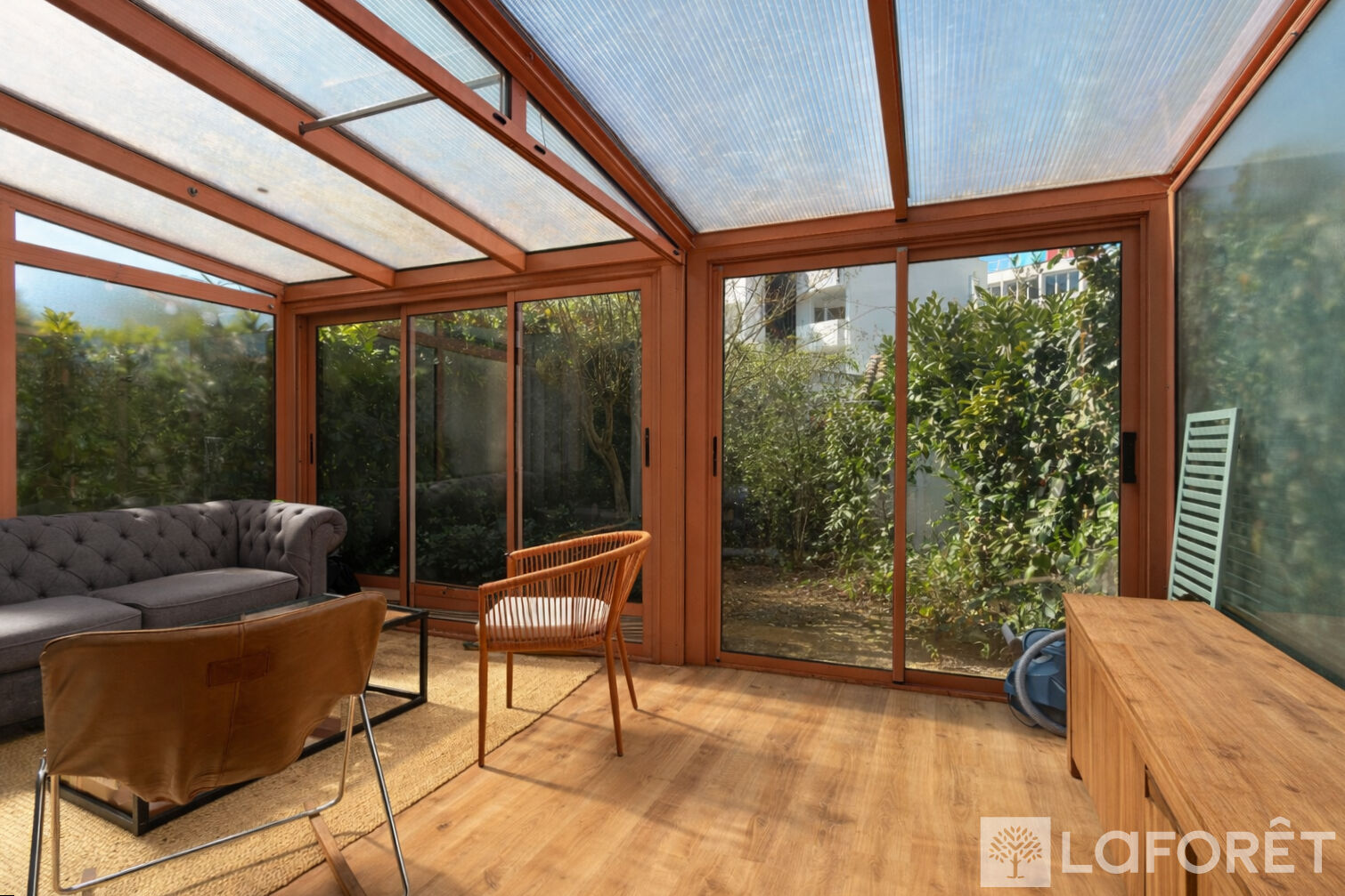 À l'extérieur, le jardinet accueille une Véranda cosy. La maison bénéficie également d'un accès privatif à son garage depuis le jardin, véritable plus qui vous assure stockage ou stationnement pour votre véhicule de manière sécurisé.