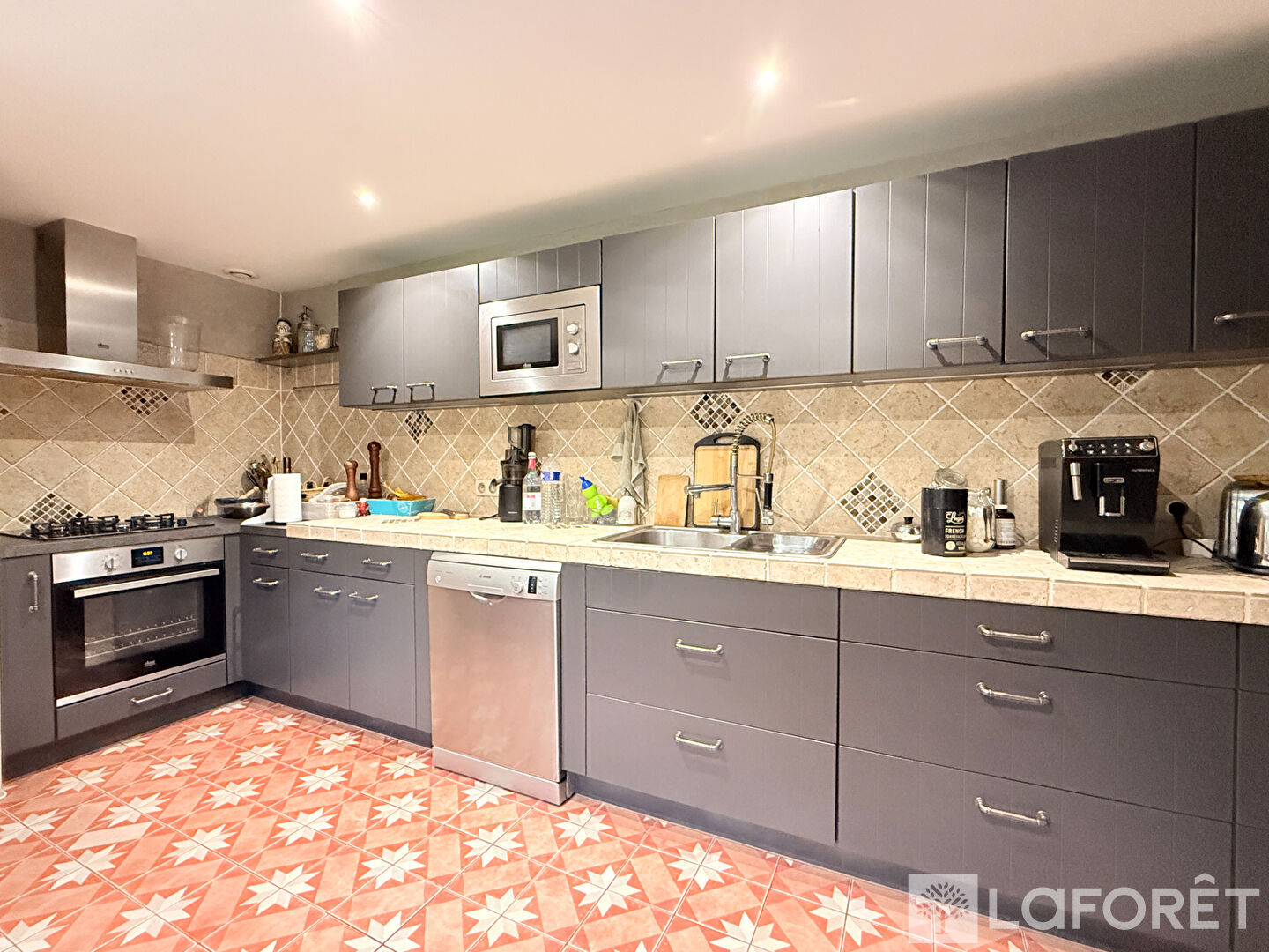 À l'intérieur, le séjour surprend par sa belle hauteur sous plafond et sa luminosité. Les grandes baies vitrées ouvrent largement la pièce sur le jardin, offrant une continuité naturelle entre intérieur et extérieur. La cuisine indépendante, aménagée et entièrement équipée, complète parfaitement les espaces de vie.