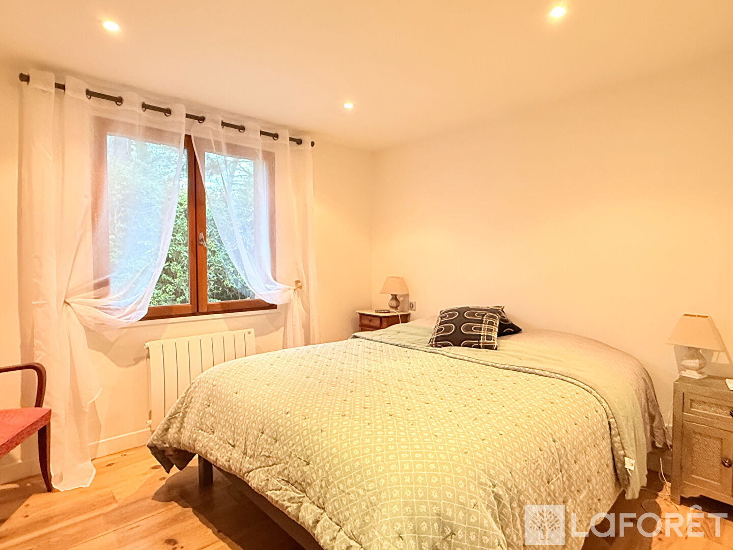 Le coin nuit propose deux chambres, dont une équipée d'un dressing, ainsi qu'une salle d'eau spacieuse. L'ensemble est fonctionnel, rénové avec soin et chauffé par une pompe à chaleur pour un confort au quotidien.