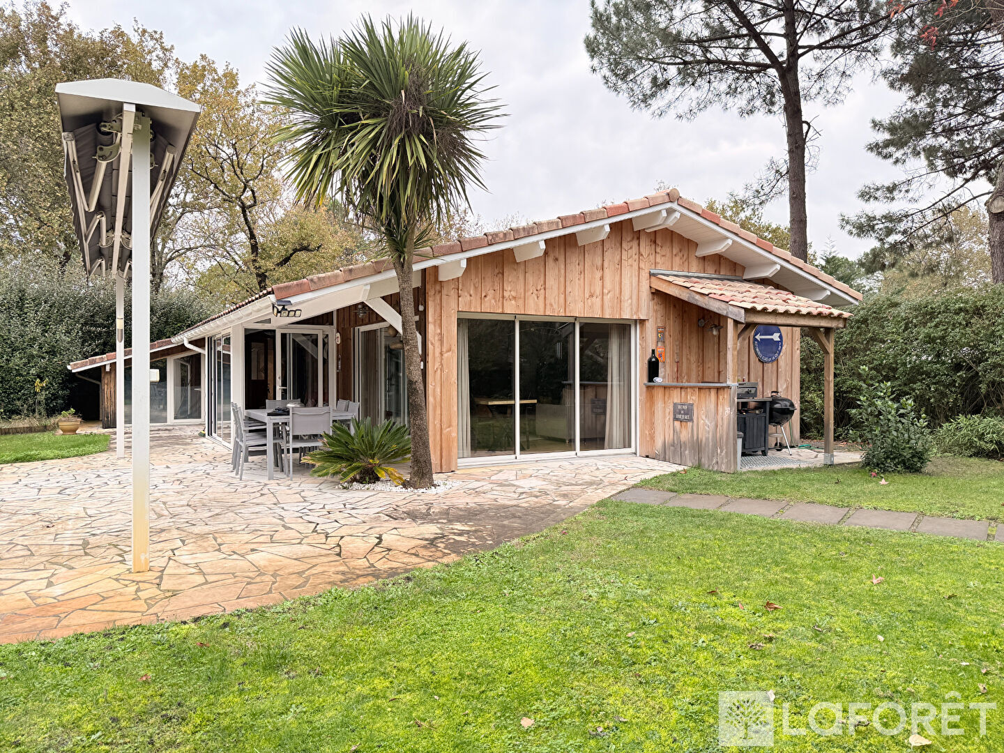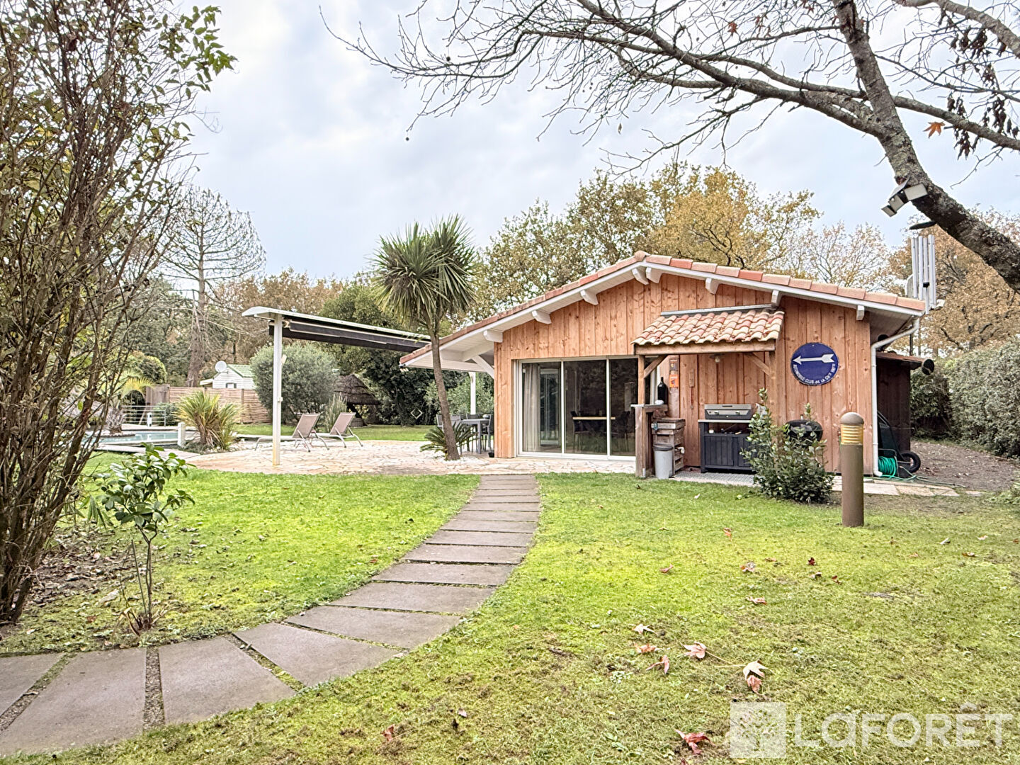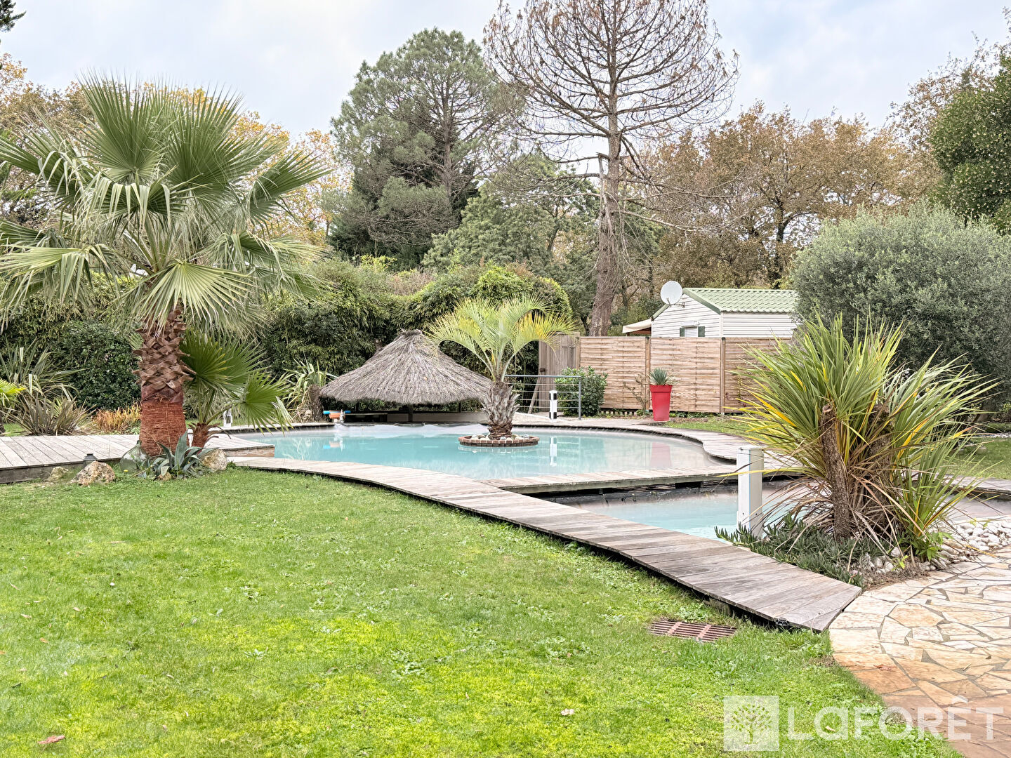 À l'extérieur, le terrain rassemble de nombreux atouts : un car-port traditionnel, un garage/atelier, un local vélo en dur et une terrasse qui longe la maison. La piscine maçonnée avec débordement crée un véritable espace de détente. Un tiki bar, un cabanon et plusieurs zones aménagées permettent de profiter du jardin en toutes saisons.