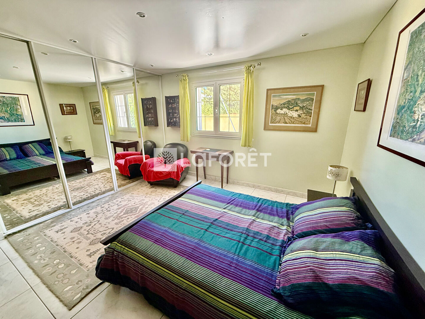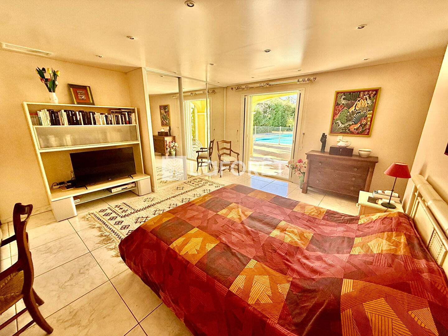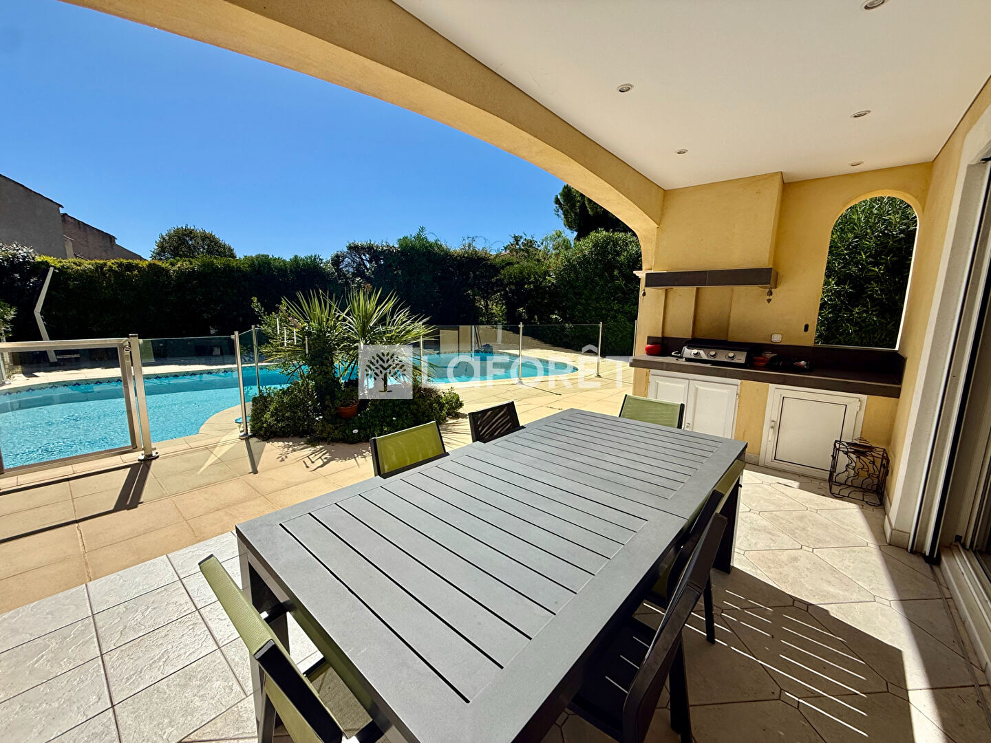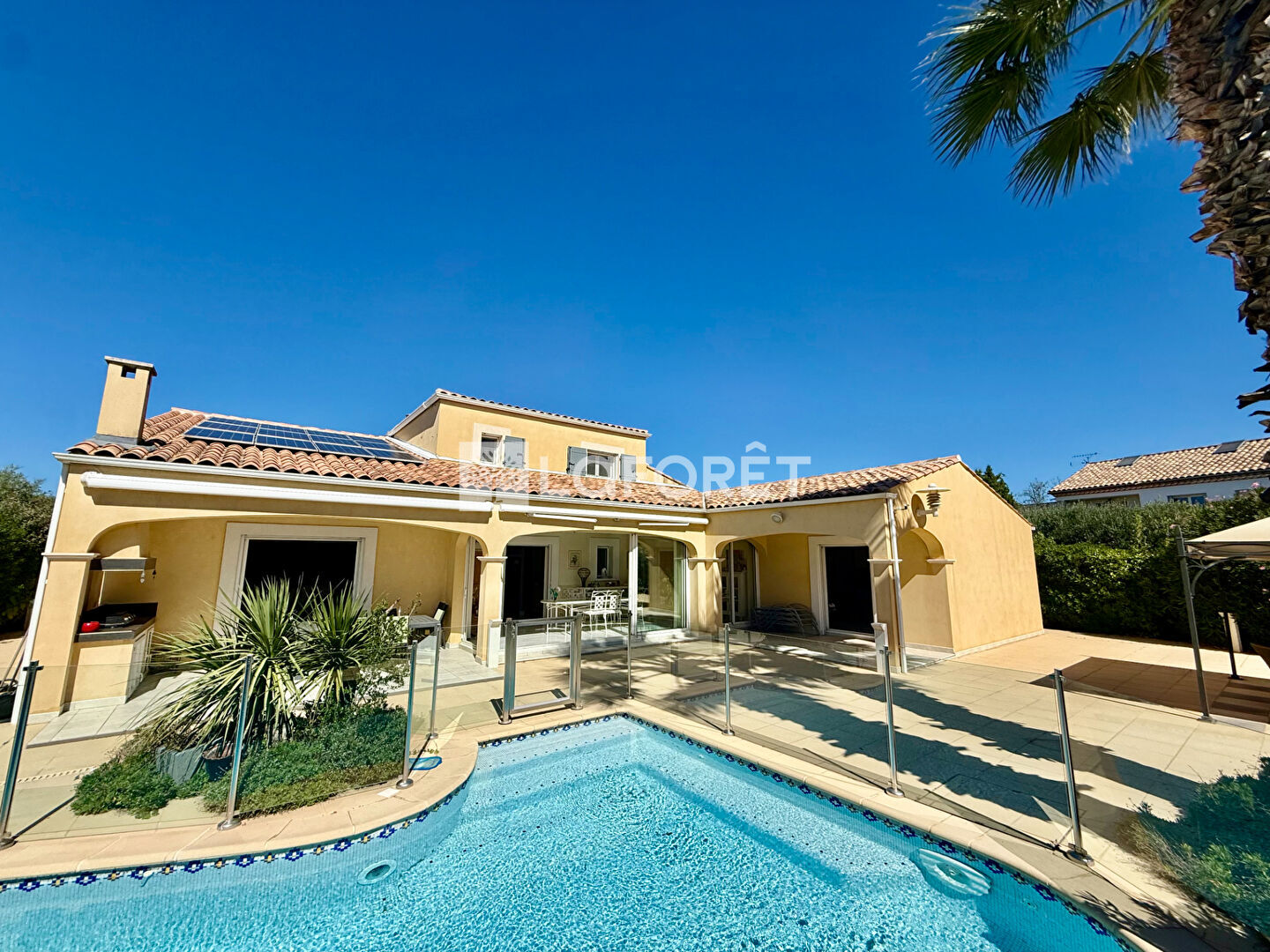 À l'extérieur, la piscine traditionnelle faïencée avec garde-corps vitré . Le terrain, soigneusement aménagé pour limiter l'entretien, bénéficie d'une terrasse couverte et de nombreux espaces.