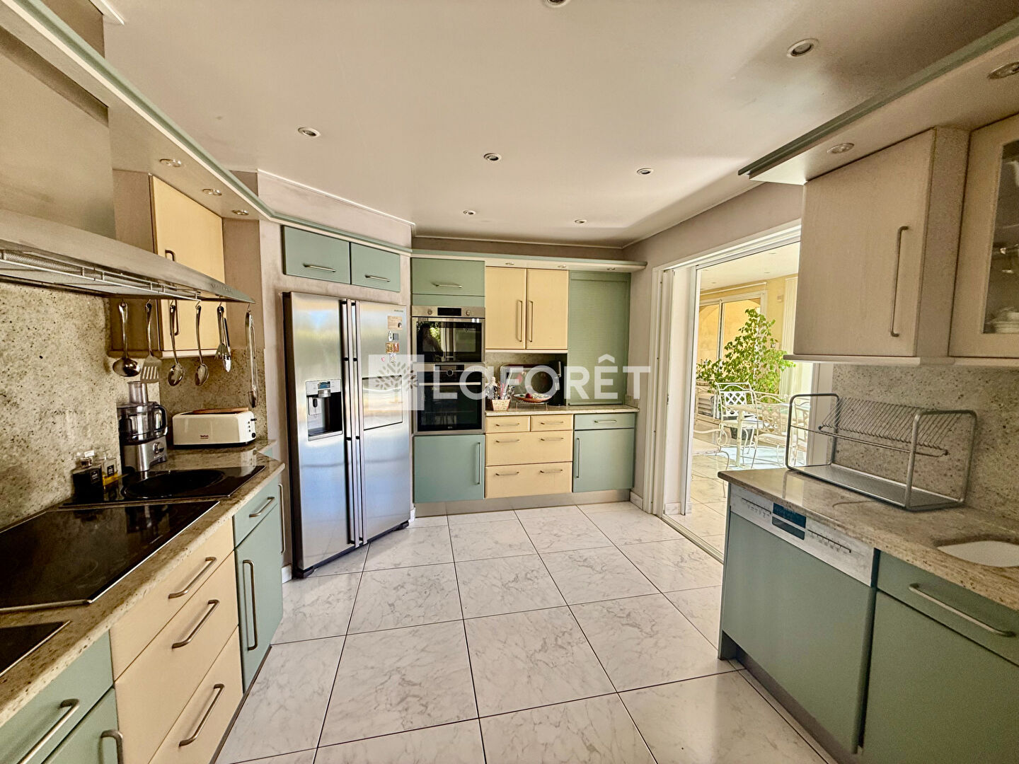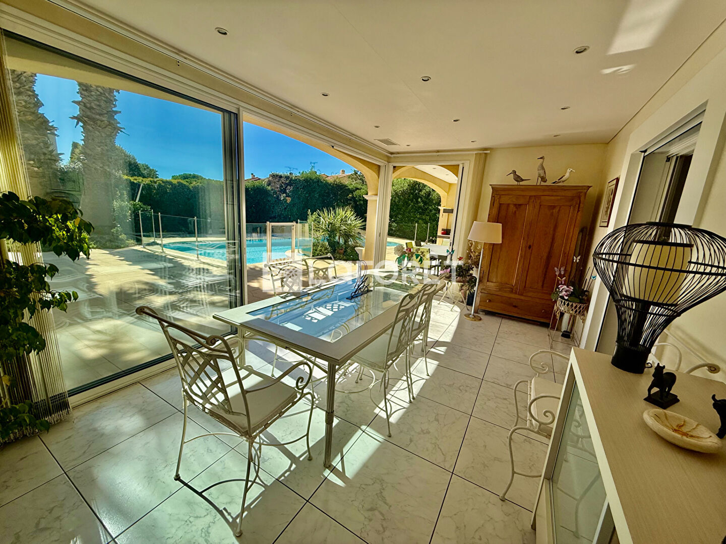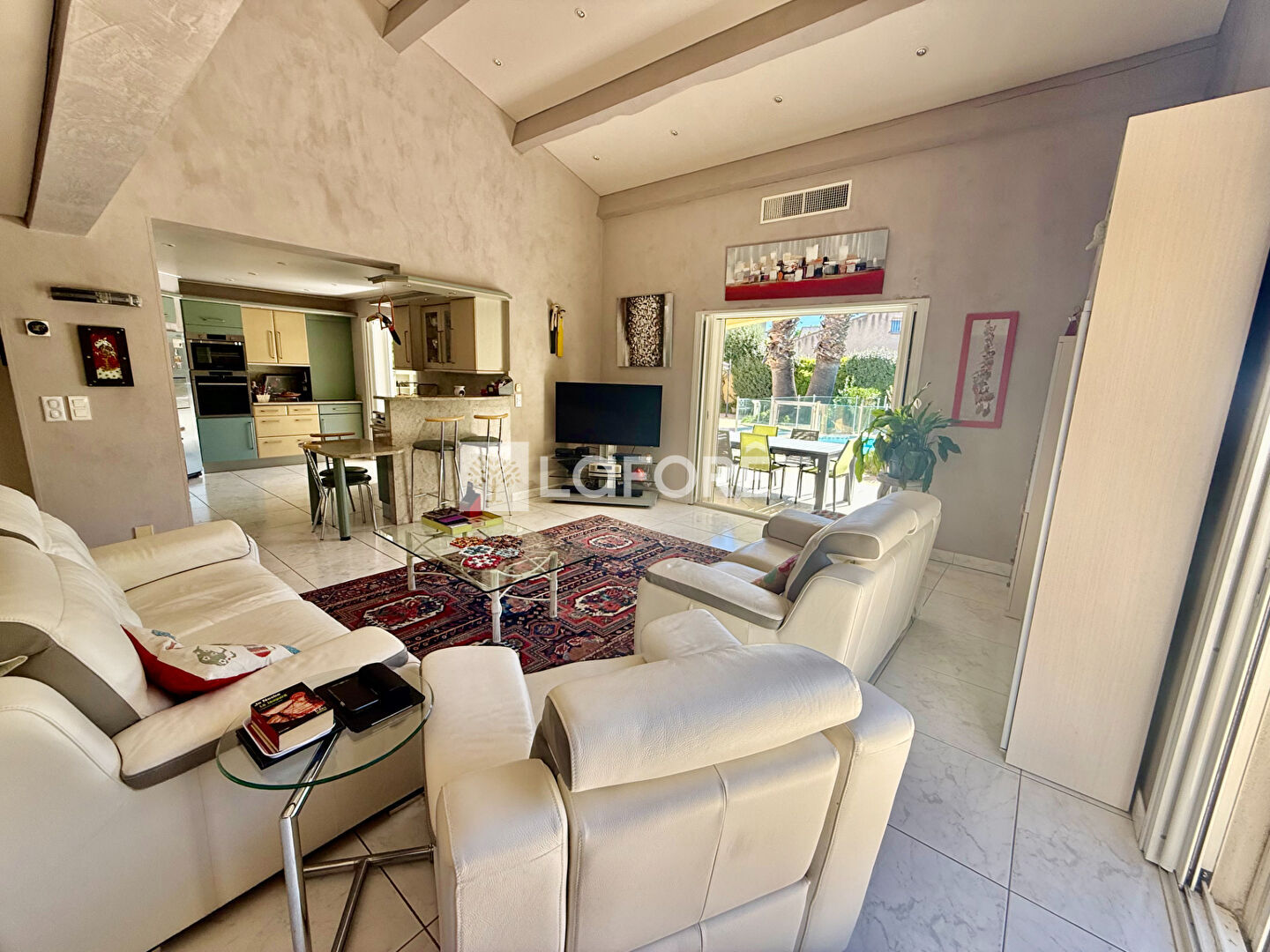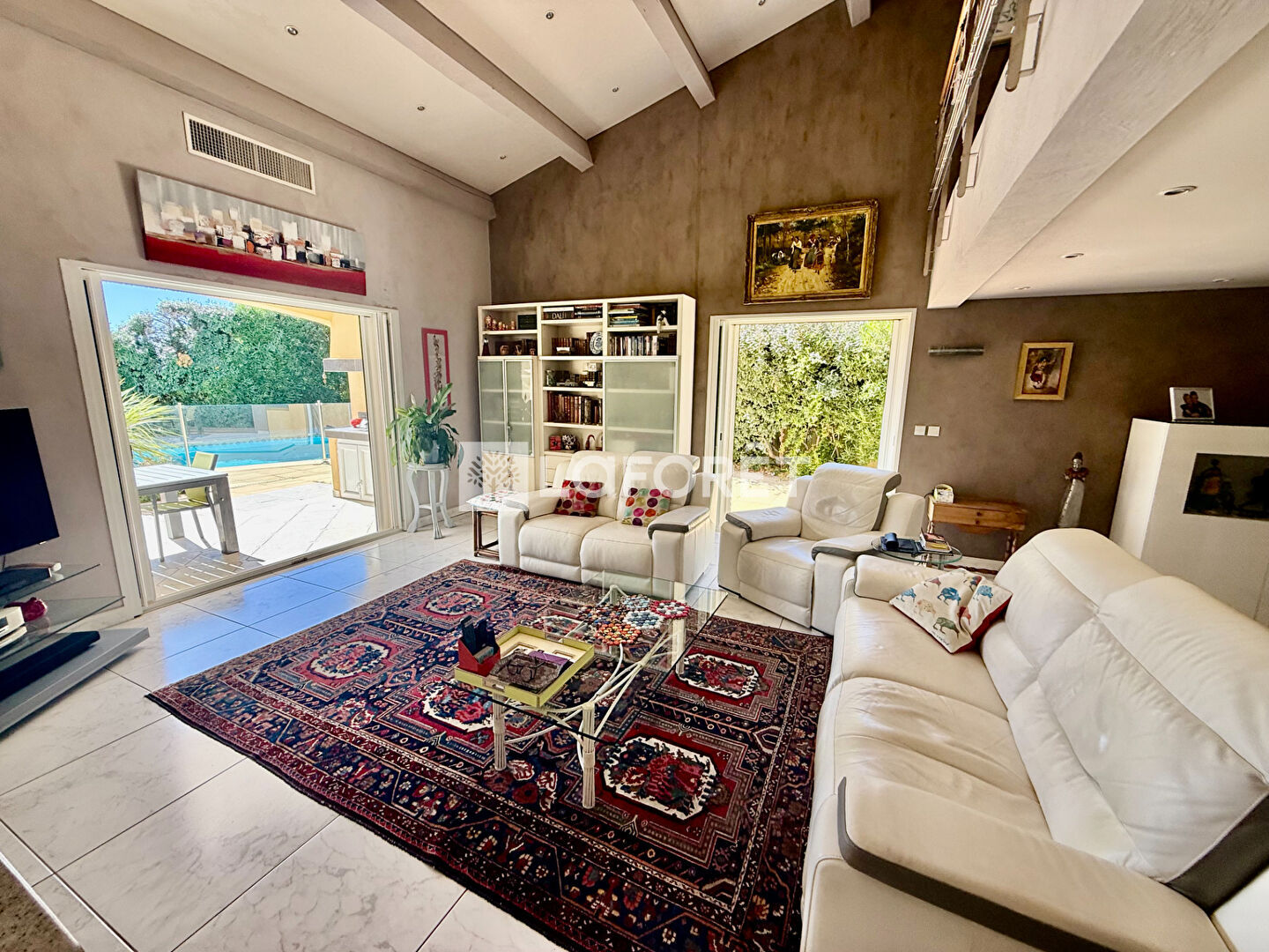 À l'extérieur, la piscine traditionnelle faïencée avec garde-corps vitré . Le terrain, soigneusement aménagé pour limiter l'entretien, bénéficie d'une terrasse couverte et de nombreux espaces.