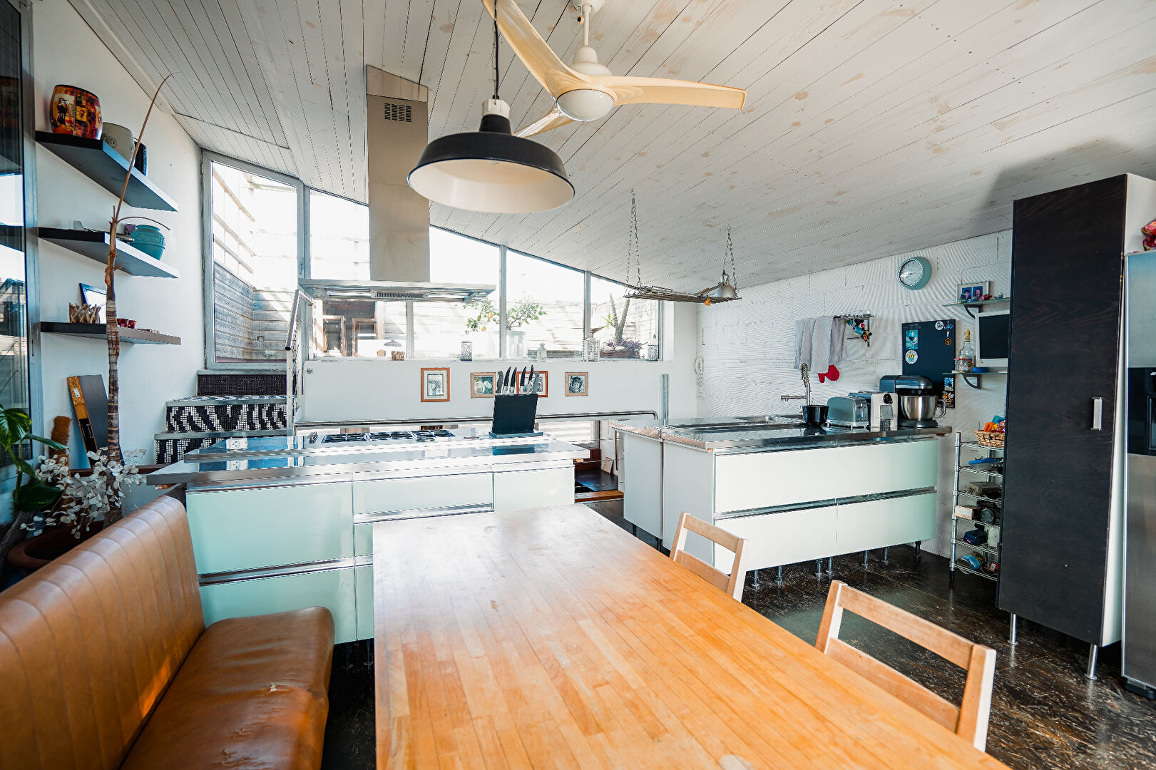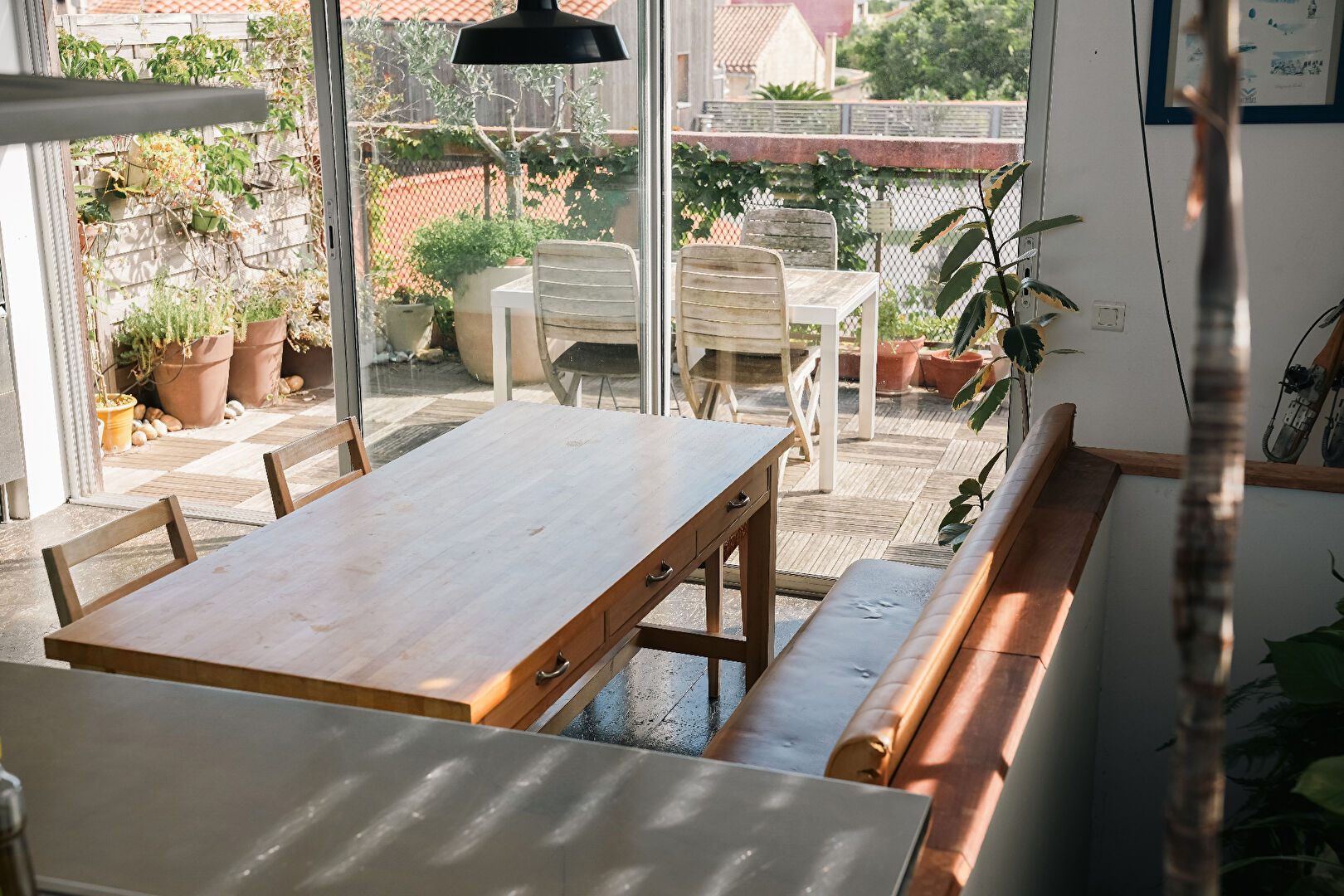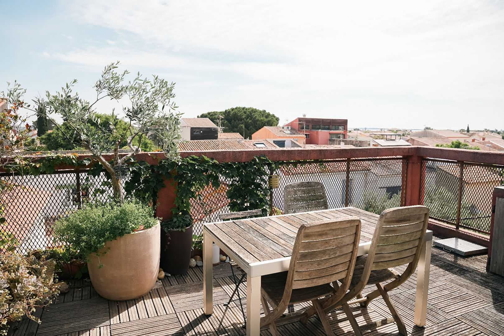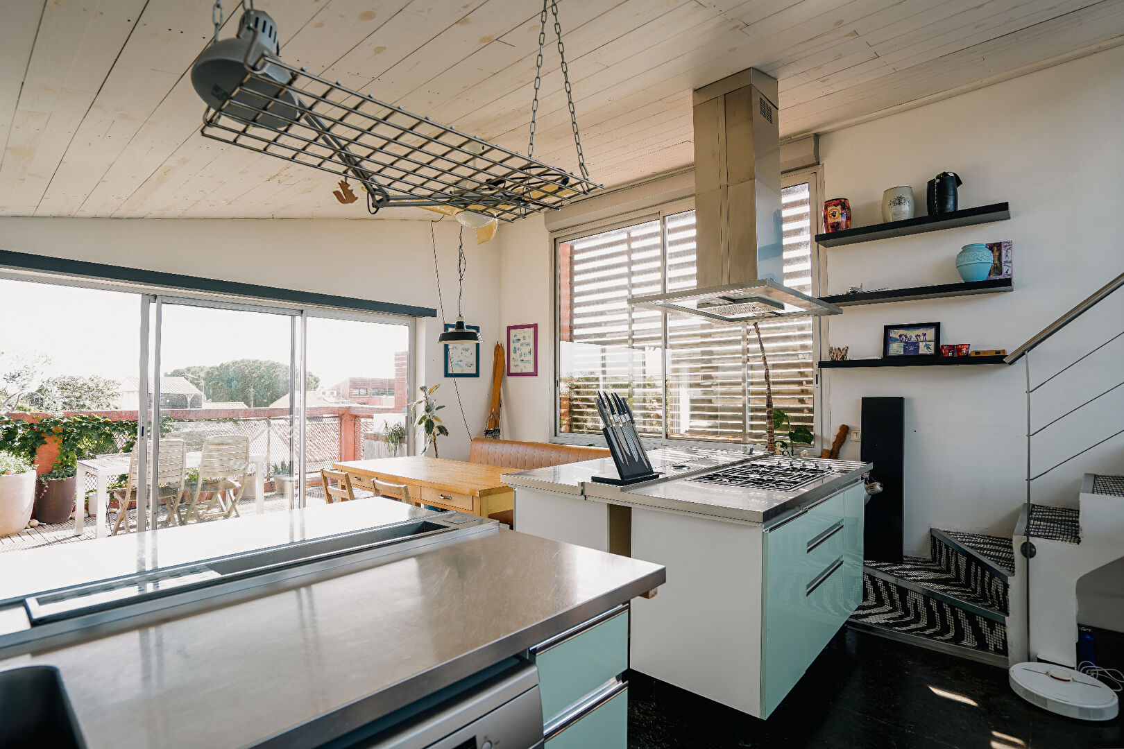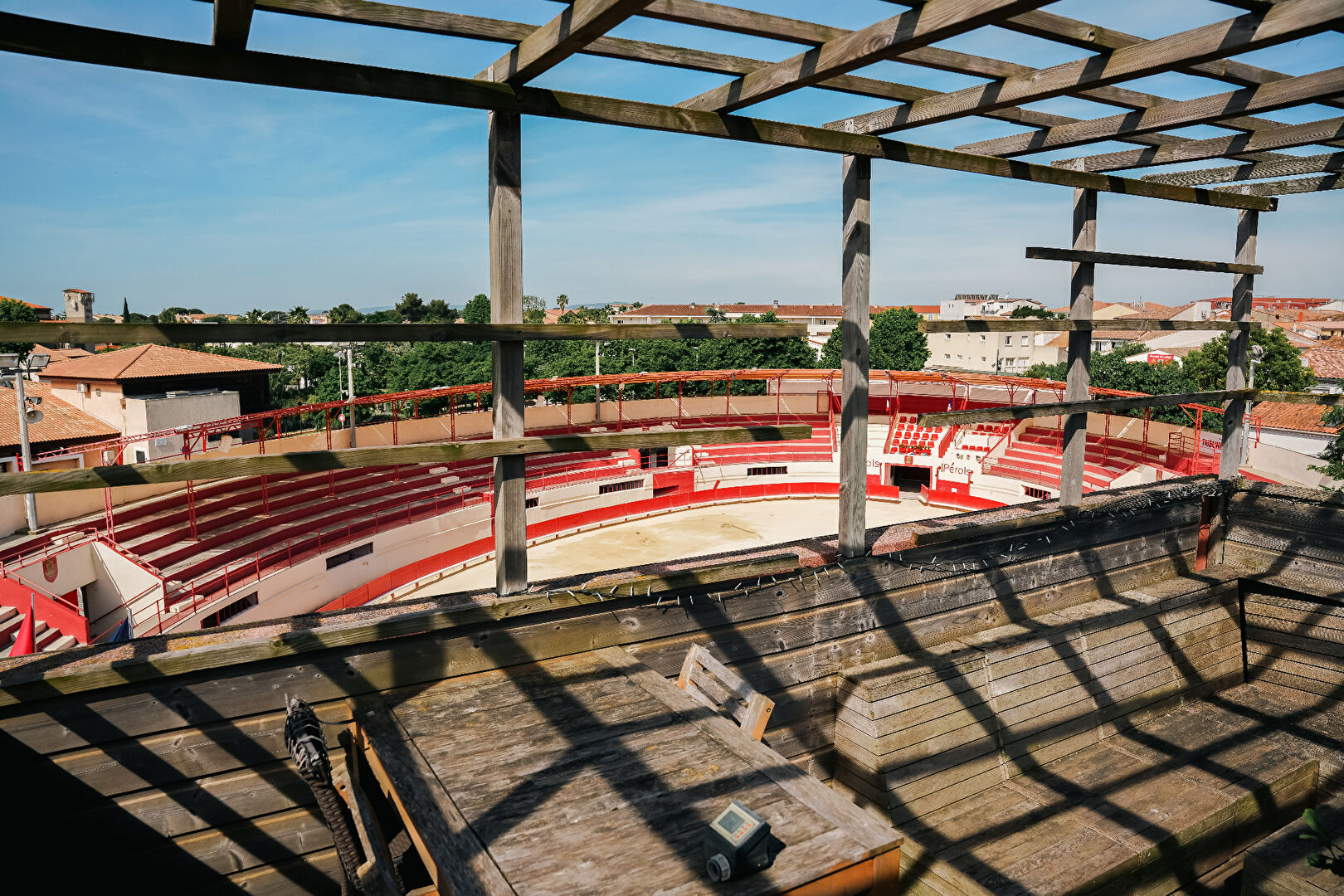 Cuisine ouverte donnant sur deux terrasses (17 m² et 14 m²), l'une avec vue sur les toits du village, l'autre avec vue panoramique sur les arènes.
