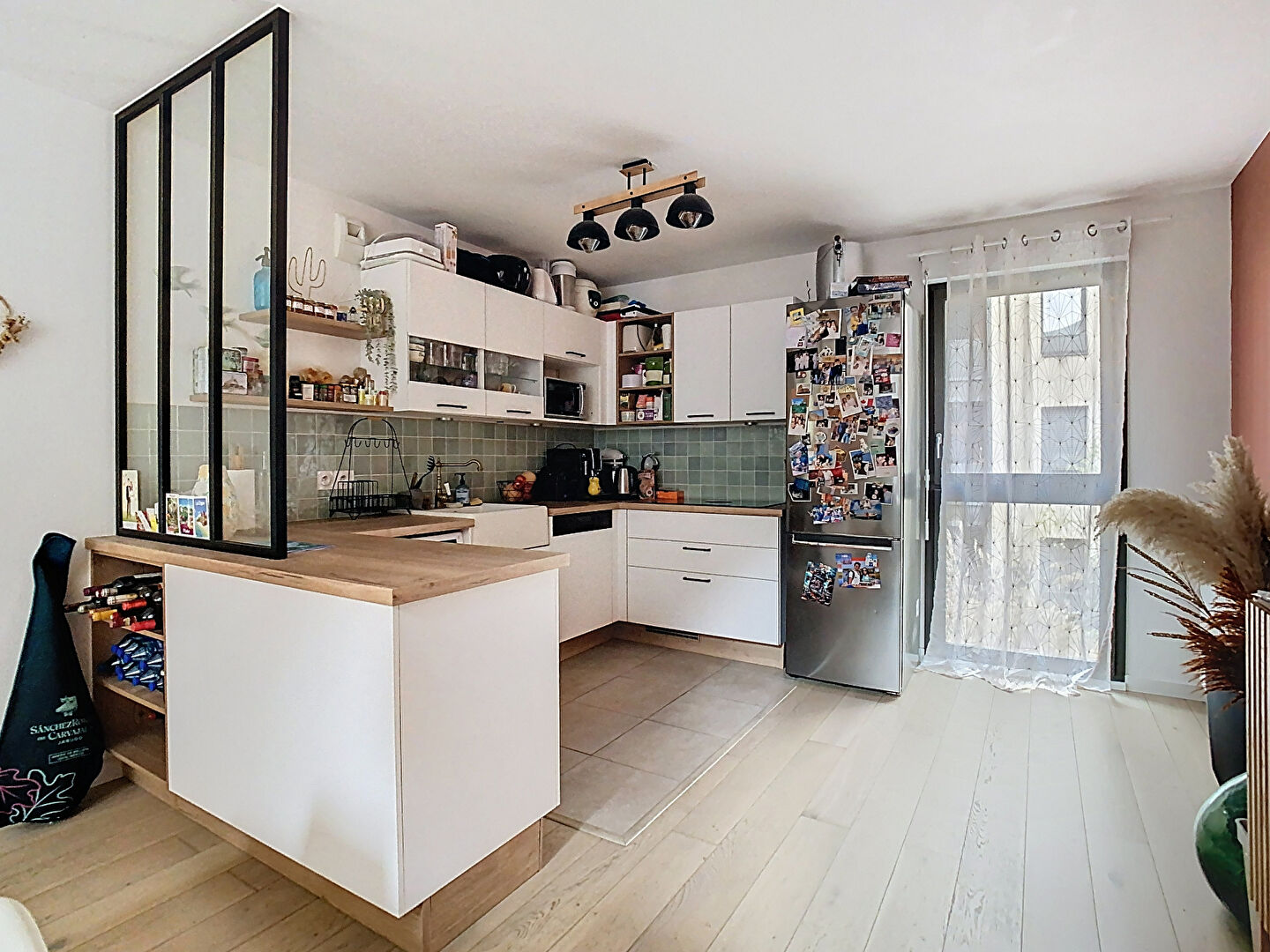 La pièce de vie offre un cadre convivial et chaleureux, idéal pour recevoir, et s'ouvre sur une cuisine ouverte entièrement aménagée et équipée, mise en valeur par une élégante verrière qui structure l'espace tout en laissant passer la lumière.