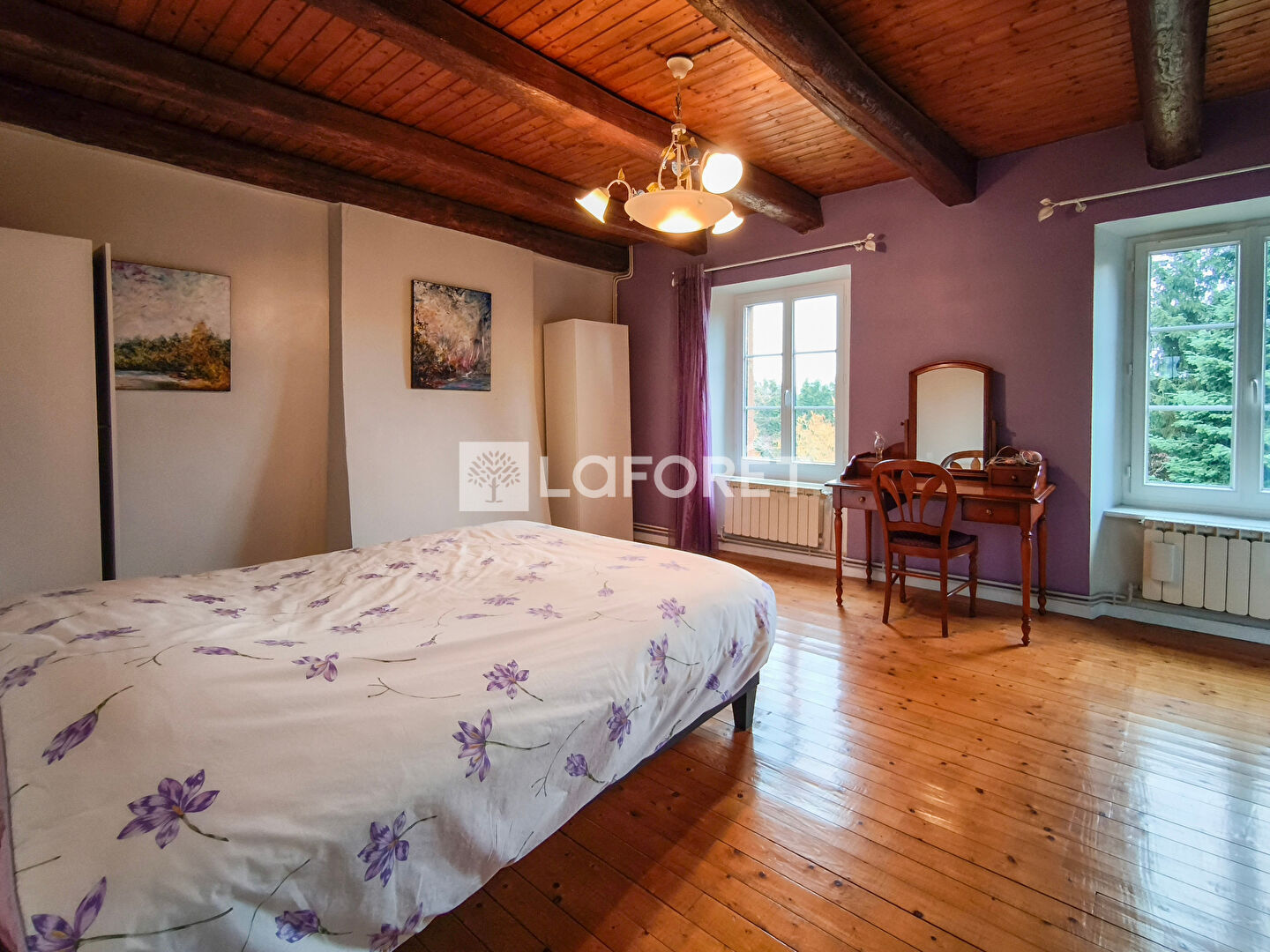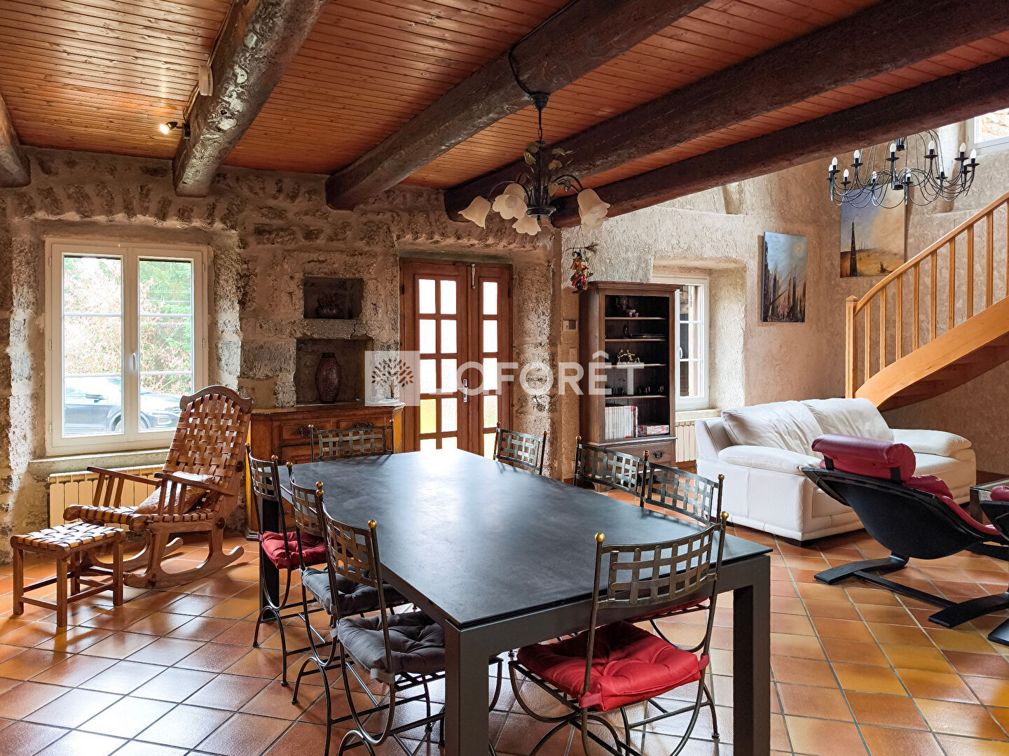 Cette belle propriété, sans vis-à-vis, est implantée sur un terrain plat et arboré attenant de 5369 M2 dont une grande partie est constructible. D'une luminosité remarquable, elle associe harmonieusement le caractère et le charme des vieilles pierres, de belles poutres apparentes et des grands volumes.