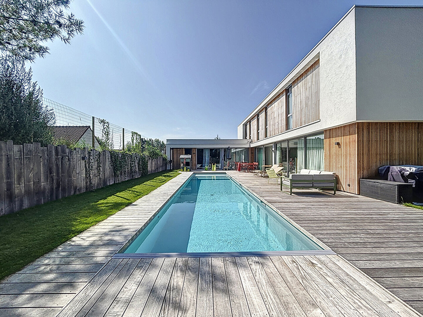 Édifiée sur un terrain paysager de 850m², cette propriété de 6 pièces offre des volumes généreux et des prestations haut de gamme: